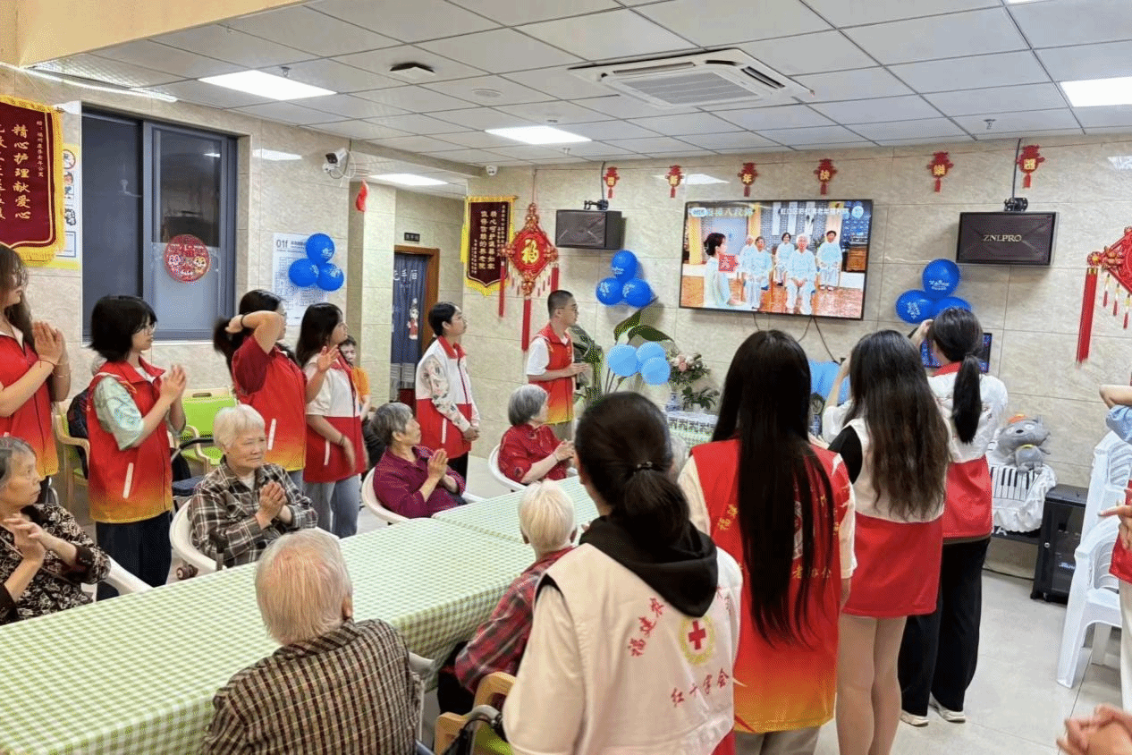 青年志愿者带着养老院的长者们一起学习手指操,并向他们介绍手掌穴位保健的相关知识,提醒大家平时加强手部肌肉运动可促进血液循环,刺激神经末梢,可以有效缓解糖尿病、心脏病等疾病。