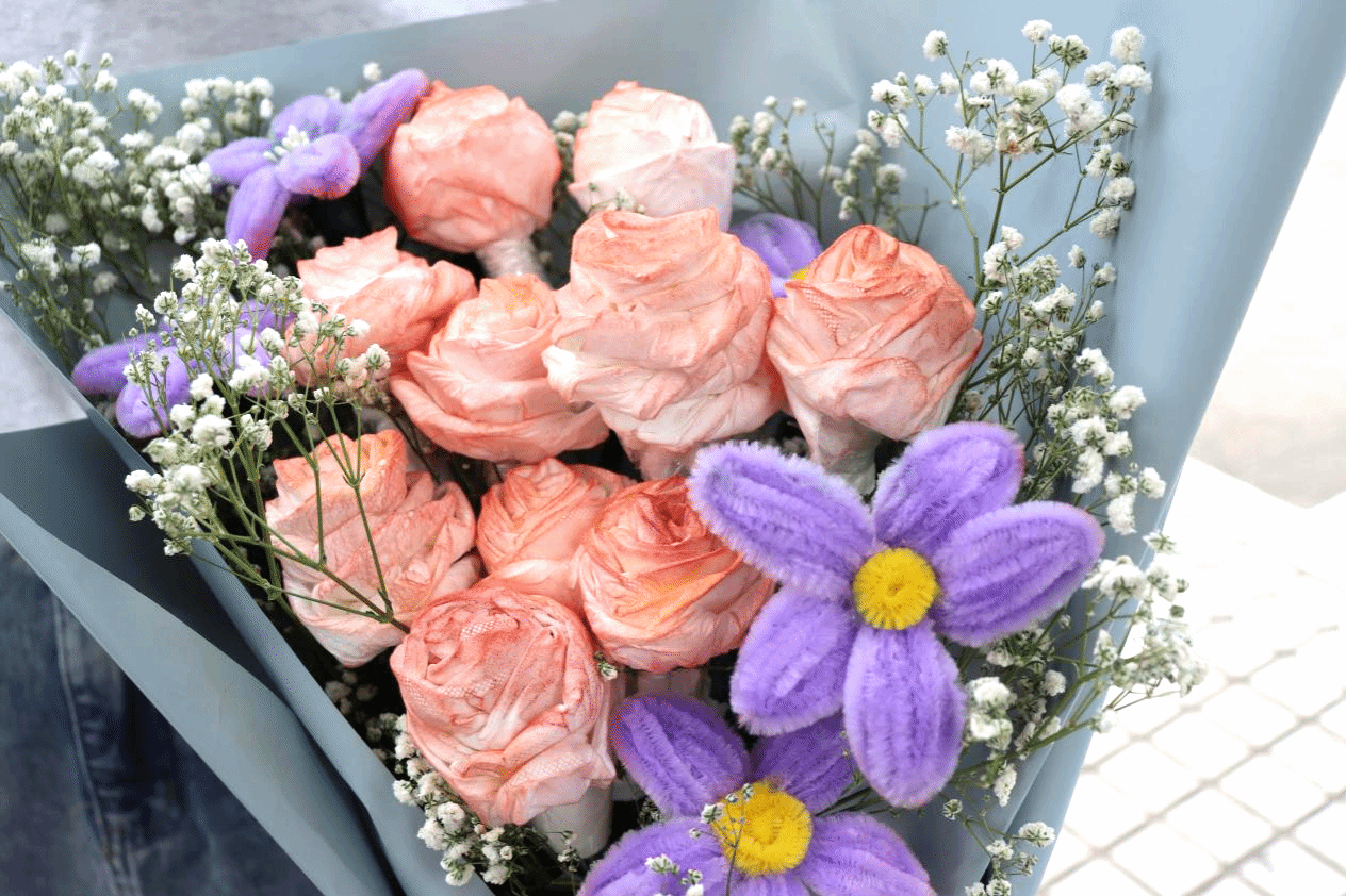 活动吸引了众多同学积极参与,红十字会志愿者将提前准备好的手工材料分发给同学们,大家借助手中材料,充分发挥自己的想象力,一束束独一无二的手工花束逐渐成形,每一朵花都承载着同学们对老师深深的祝福与感激之情。接着,同学们把对老师的祝福语写在“刮刮乐”贺卡中,并加密封存,希望自己写的祝福语能被老师抽中。同学们看着亲手完成的作品,脸上洋溢着开心的笑容。