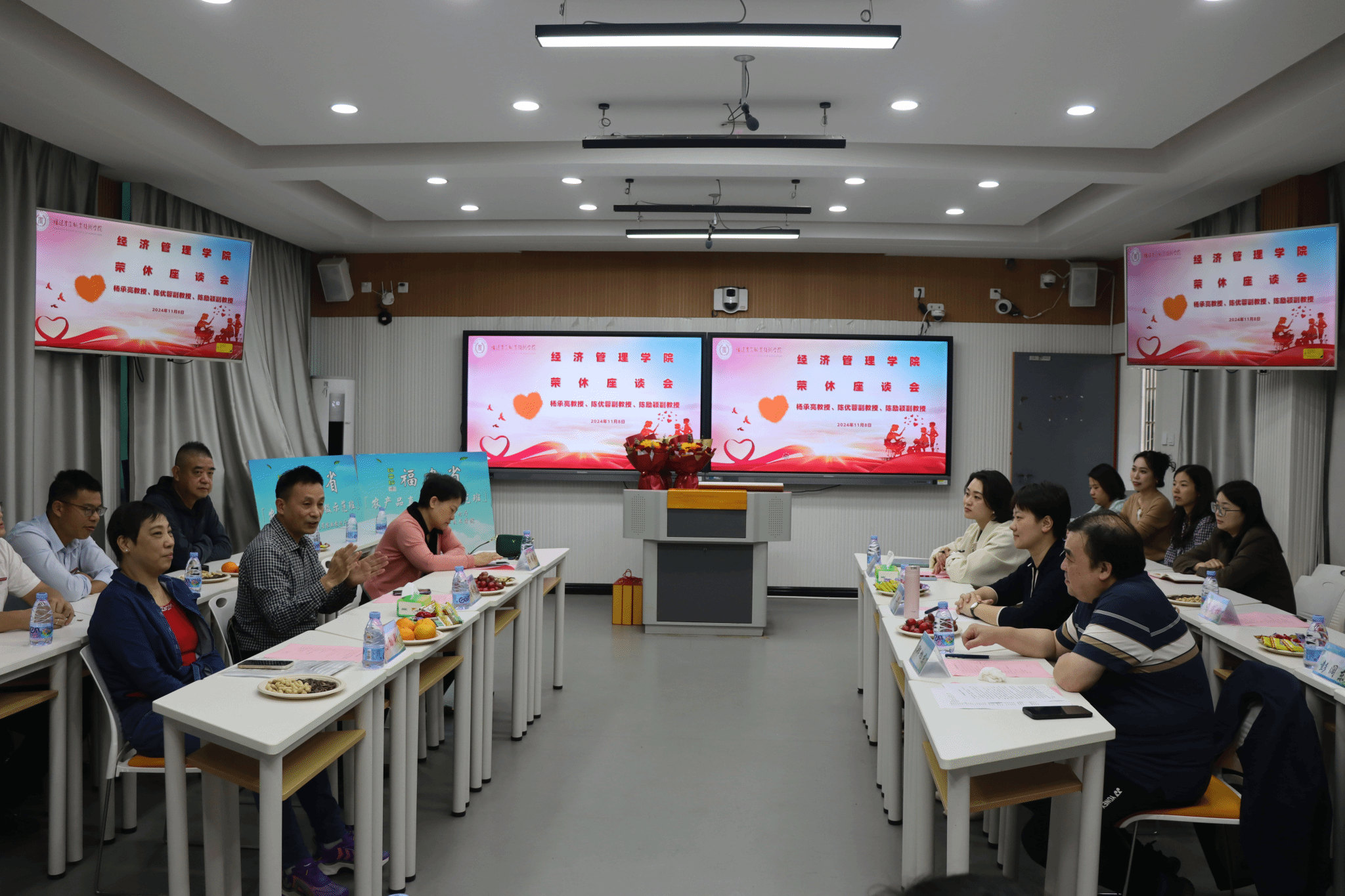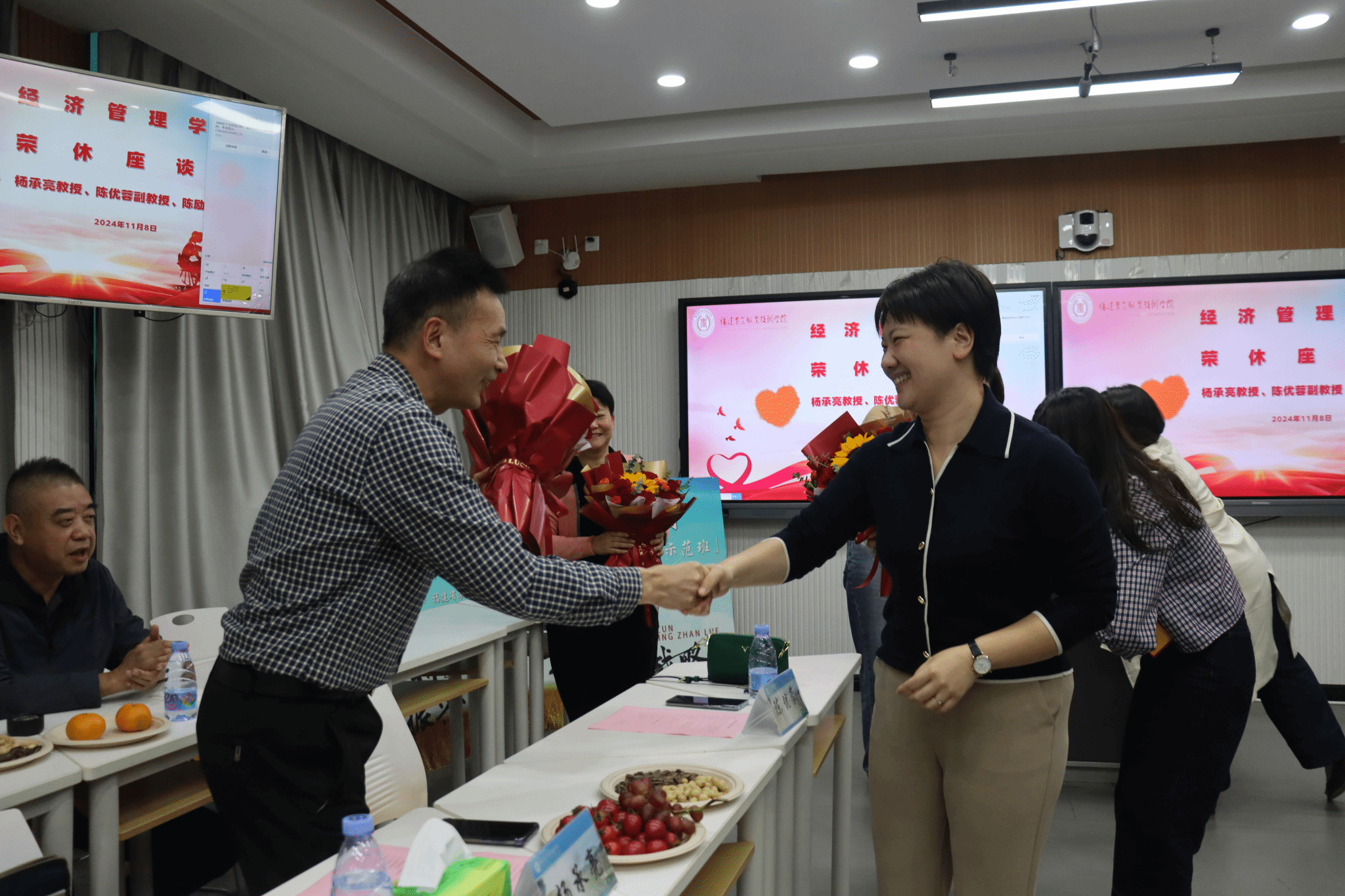 2024年11月8日下午,经济管理学院在教学楼201教室举行了一场温馨而庄重的退休教师荣休座谈会,以感谢和欢送为学院教育事业作出杰出贡献的杨承亮教授、陈优蓉副教授和陈励颖副教授。
