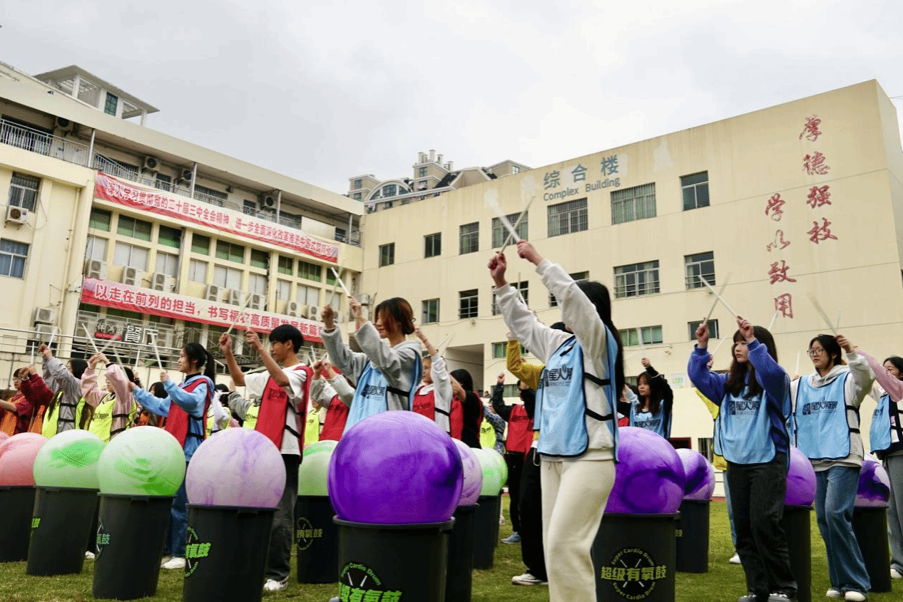 “律动有氧鼓”“圣塔”“彩虹五子棋”“疯狂毛毛虫”等活动环节中,同学们相互进行头脑风暴,积极出谋划策,在一次次的沟通与协作中,每支队伍都表现出步调一致、齐心协力的良好氛围。尤其在“律动有氧鼓”环节,教练将有氧鼓与音乐节奏相结合,通过跳跃、舞动、伸展等动作释放身心,促进同学们全身心投入到激情四溢的音乐运动之中。同学们在教练的引领下以团队形式进行鼓舞创编,各队伍间思维碰撞,充分激发同学们的创新创造力。