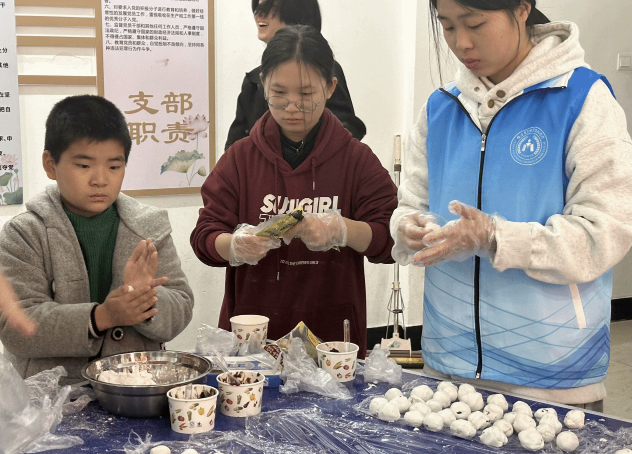 在活动现场,学生志愿者与居民们共同协作团、包馅料每双手都巧妙地将对生活的美好祈愿包裹进了每一粒汤圆之中。不多时,一盘盘饱满圆润的汤圆便摆满了桌面