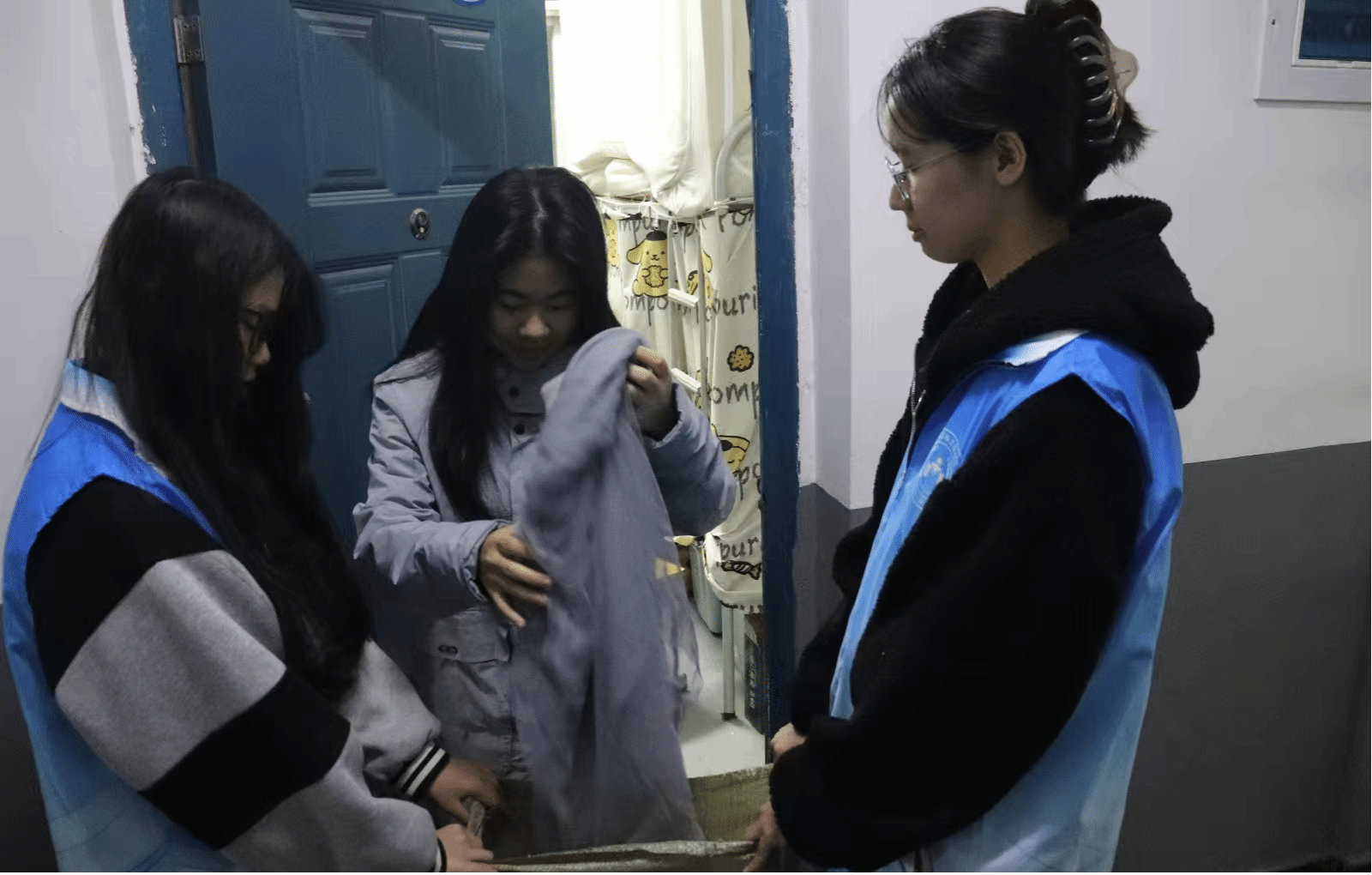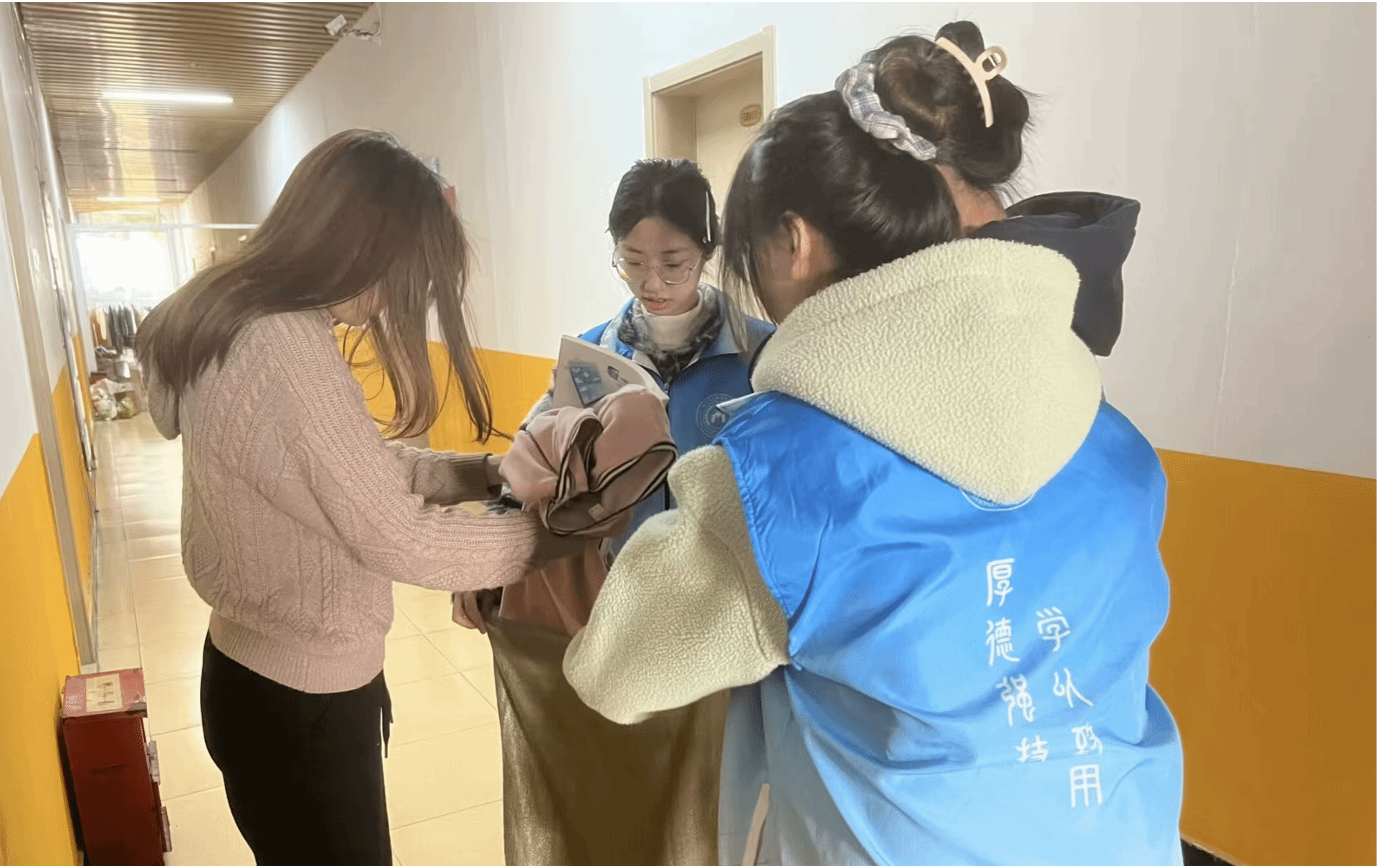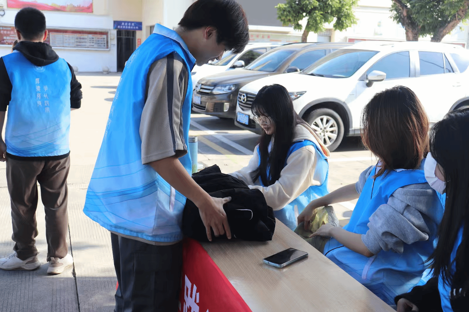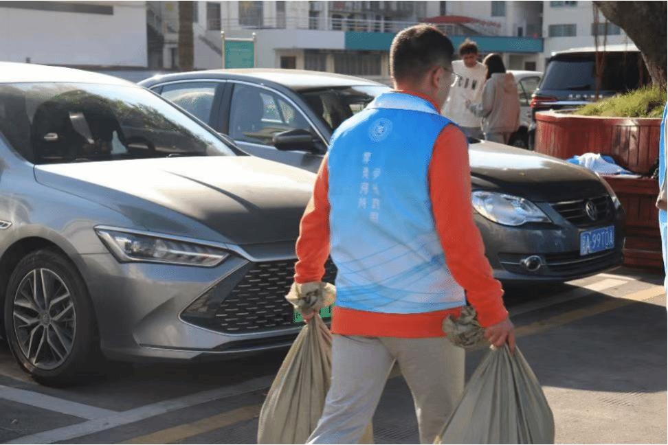 活动启动后,志愿者们分工明确,各司其职,提前做好准备工作,布置好活动场地。回收活动如火如荼地进行着,一部分志愿者手持编织袋穿梭在各个宿舍楼道间,主动上门协助同学们清理闲置物品;另一部分志愿者在旧物回收摊点负责登记捐赠物品的信息,并给同学们分发环保纪念品。