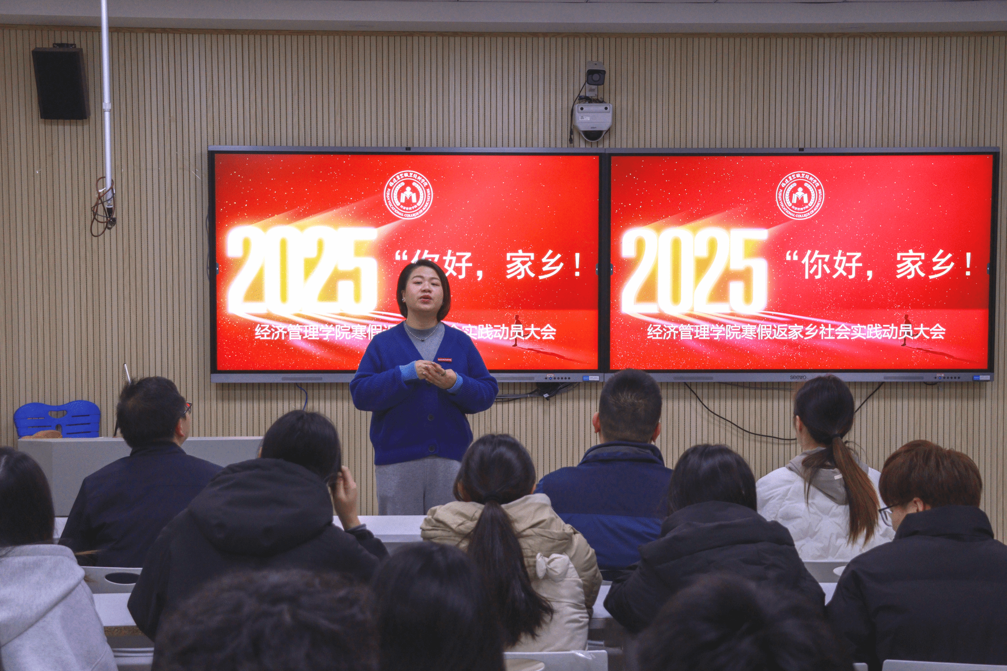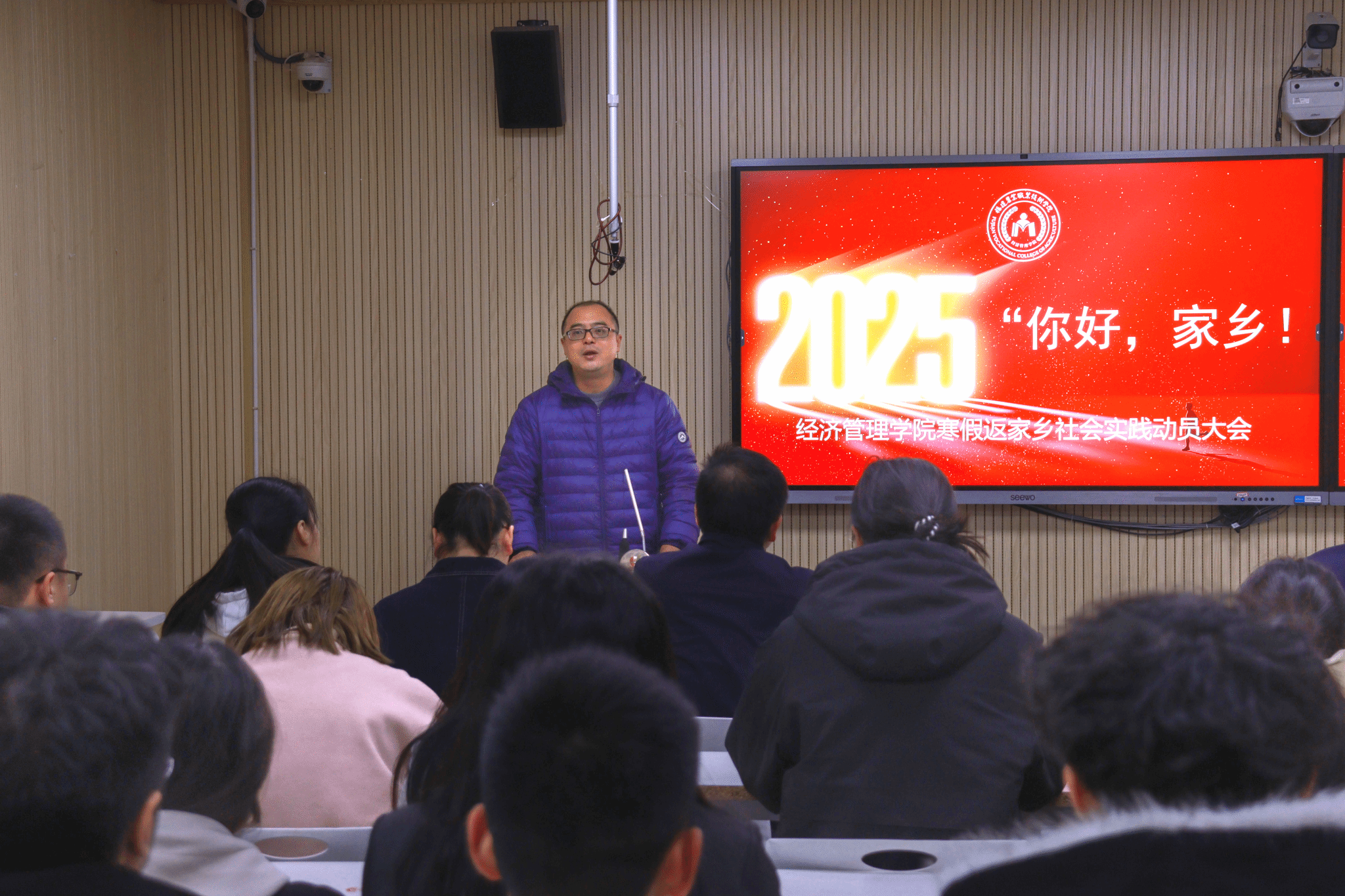 为深入学习贯彻党的二十届三中全会精神切实领会习近平总书记关于青年工作的重要思想,进一步动员引领青年学生在投身基层建设、服务家乡发展中坚定信念、增长本领、作出贡献。2025年1月7日,经济管理学院分别在首山校区和软件园教学点开展了“你好,家乡!”经济管理学院2025年寒假大学生返家乡社会实践动员大会,经济管理学院专职副书记彭阔东、辅导员代表、各班级班委参加了动员大会。