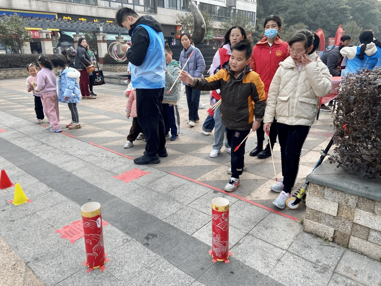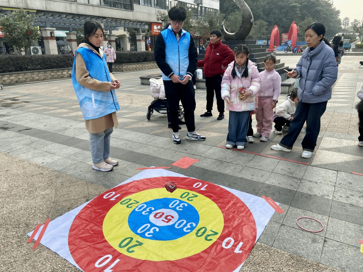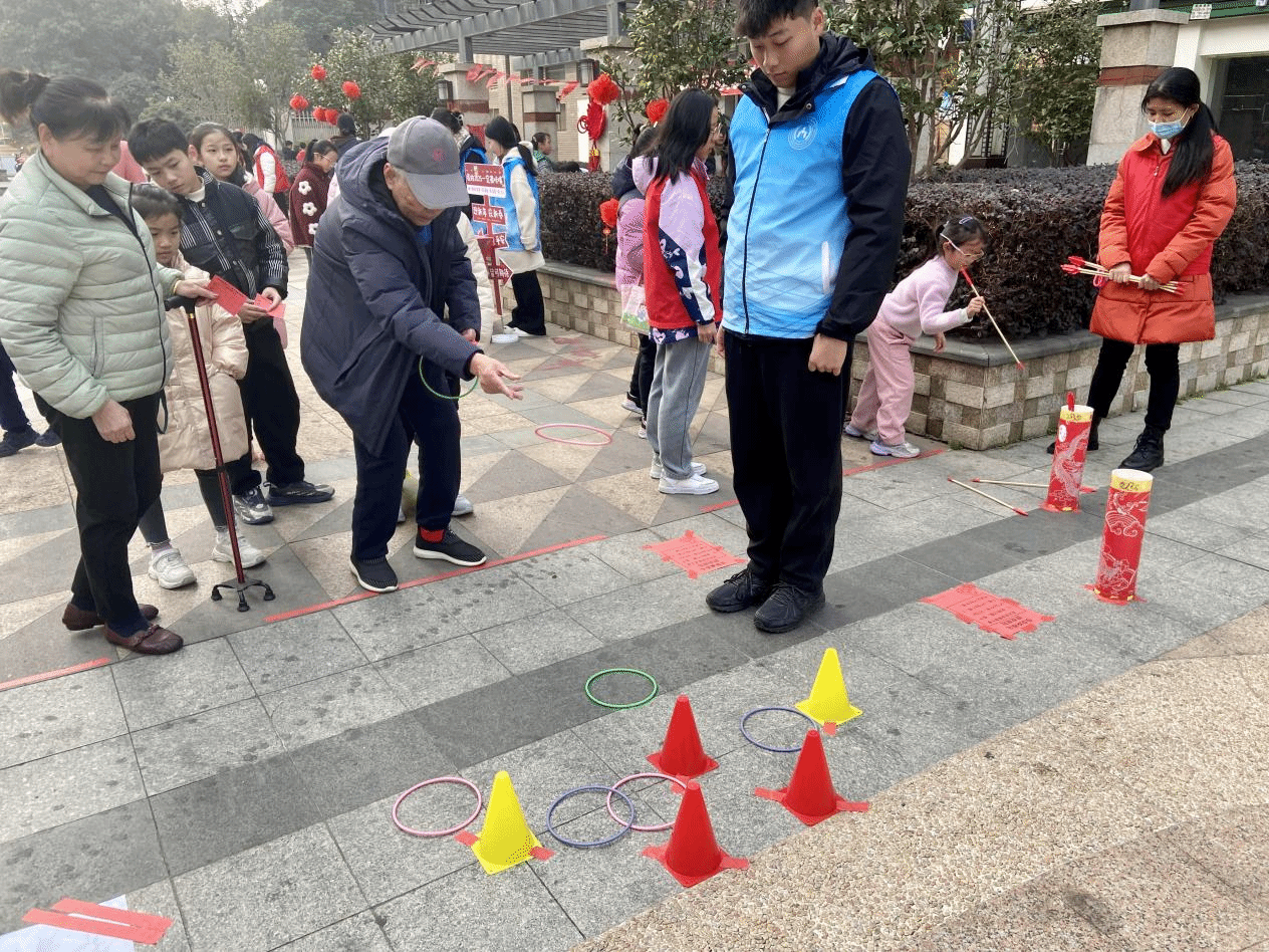 迎春活动现场准备了套圈、投壶、挂春联等丰富多彩的游戏活动,吸引了众多社区居民的热情参与。福榕志愿实践队成员们忙碌地穿梭在人群中,为居民们提供贴心周到的服务。签到区,志愿者们引导居民扫码签到;活动区,志愿者们帮忙解释每个活动的流程,组织各项活动有序开展;兑奖区,志愿者们为参与居民兑换礼品。活动现场热闹非凡,欢声笑语不断。