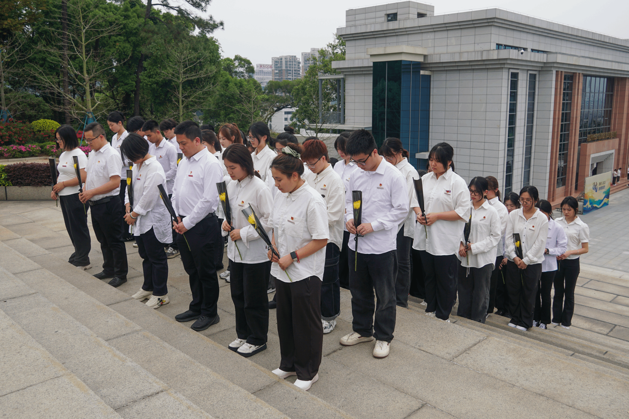 在革命英烈纪念碑前,全体人员庄严肃立,低头默哀,行三鞠躬礼,以表达对先烈们的深切缅怀。随后,师生代表依次上前,将手中鲜花轻轻放在碑前,致敬他们的不朽忠魂。
