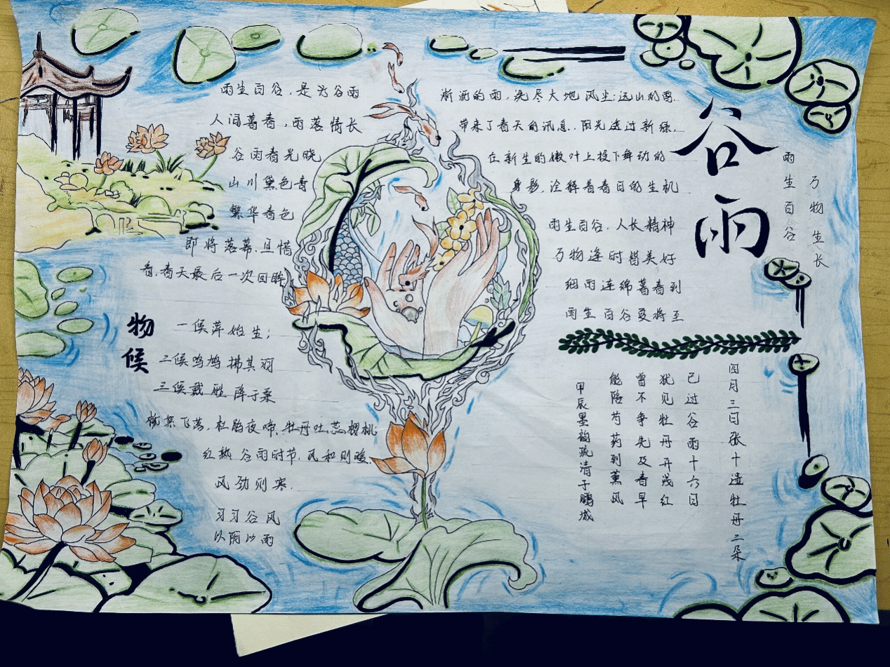 活动分别开设“手抄报设计”和“书签设计”两个赛道。在参与过程中,同学们主动去了解谷雨相关知识,并发挥自己的想象力和创造力绘制作品。在作品中用丰富的色彩和植物元素去描绘春天的景色,展现出生机与美好,体现了同学们对亲人的思念以及对美好生活的向往。经过层层选拔,本次活动诞生了多幅优秀作品。