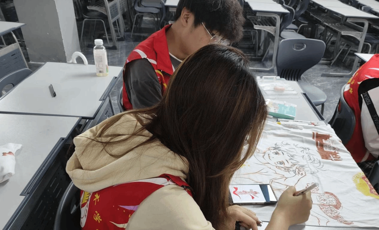 随后志愿者准备好白色T恤绘画工具,大家以白T为媒,以画笔为介,在白T上描绘青春的色彩,描画出自己心中关于团的记忆,创造出属于每个人的“限量版”T恤。
