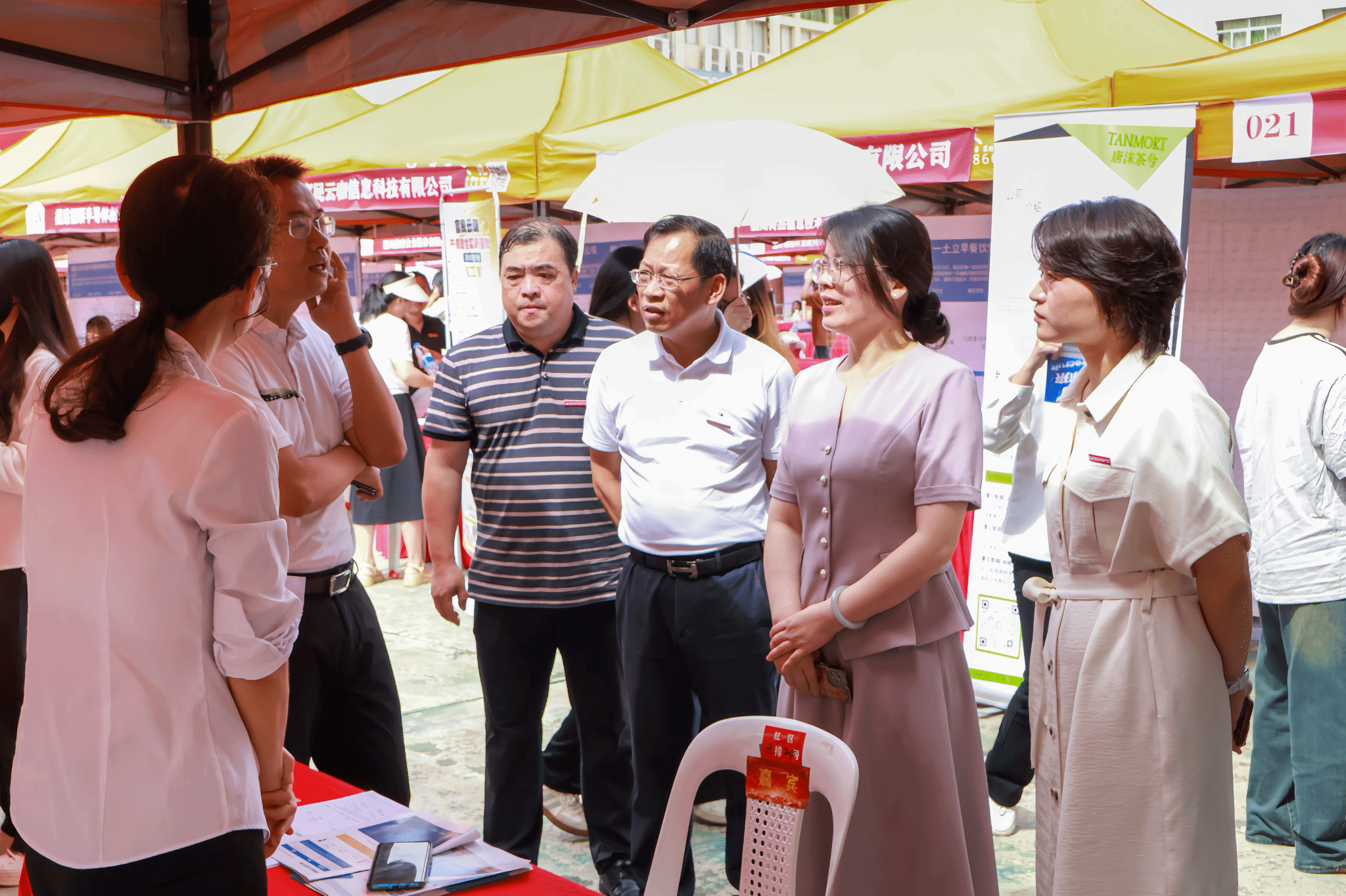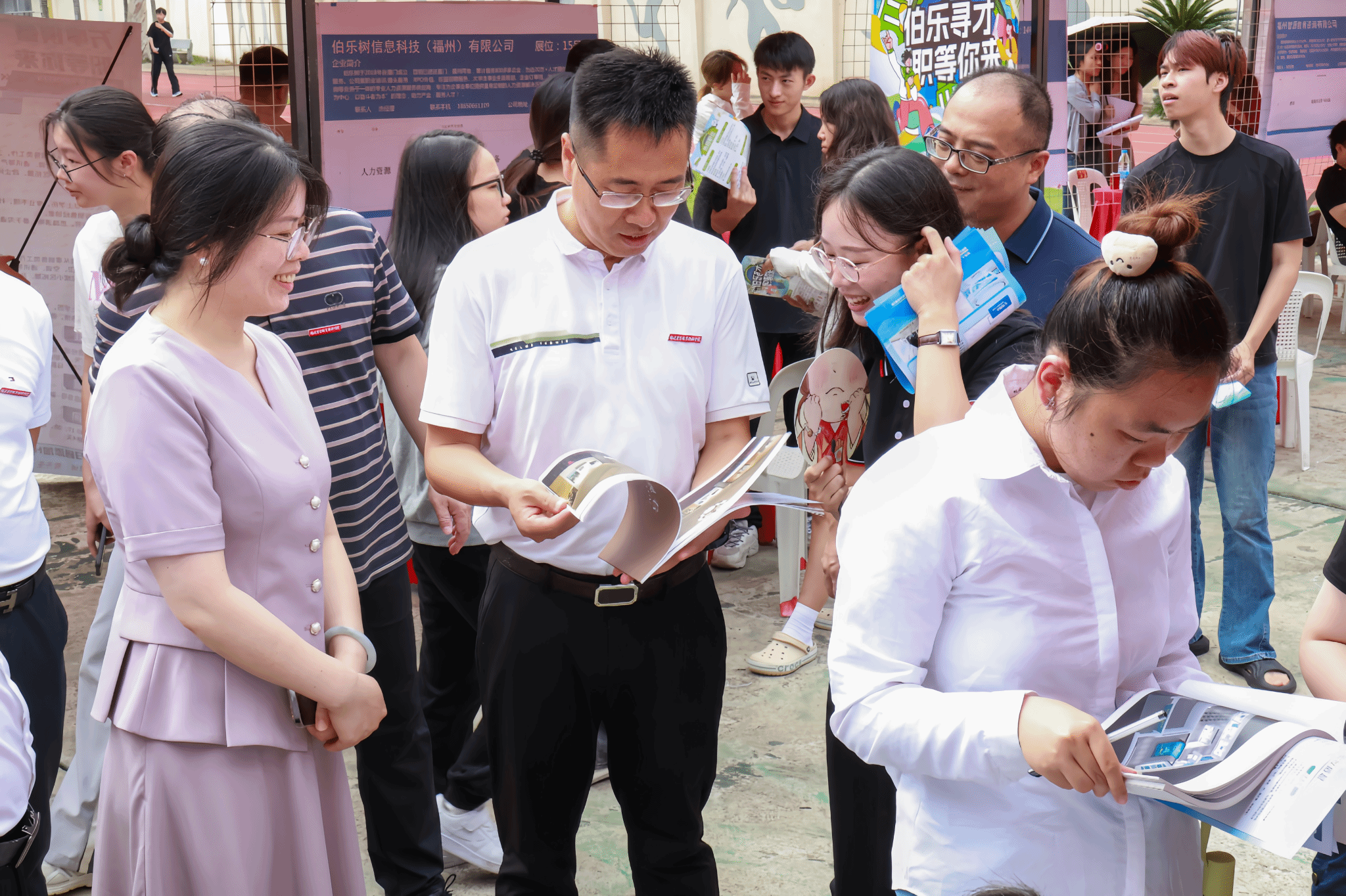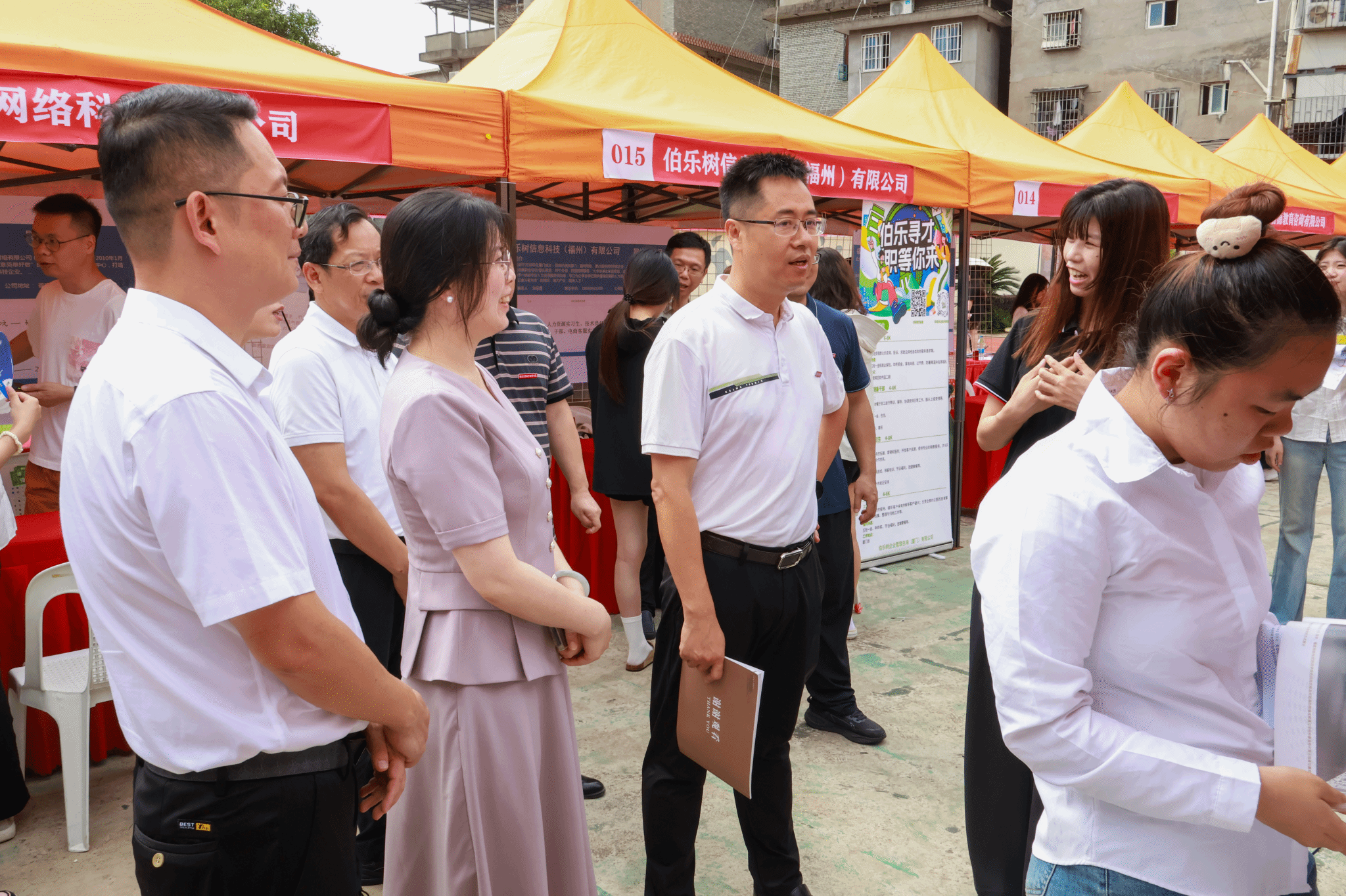 仓山区人社局局长徐庄庄、副局长欧贞敏等一行7人莅临现场,深入了解企业招聘需求、岗位设置及学生求职动态,并与参会企业学生亲切交流,对招聘会的组织工作及促进校地企合作、服务学生就业的成效给予了充分肯定与指导。