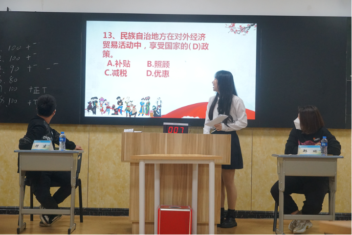 活动伊始,播放了由维吾尔族、侗族、回族、畲族等少数民族队长介绍各民族的录制视频,让在场的师生遨游在民族知识的海洋。紧接着,进行了民族知识笔试、知识抢答、知识大冒险三个环节的比拼最终由畲族队长雷锦尧同学带领的团队脱颖而出,斩获冠军。