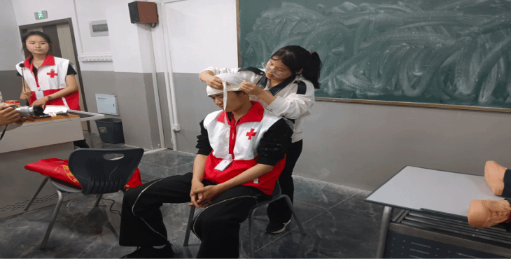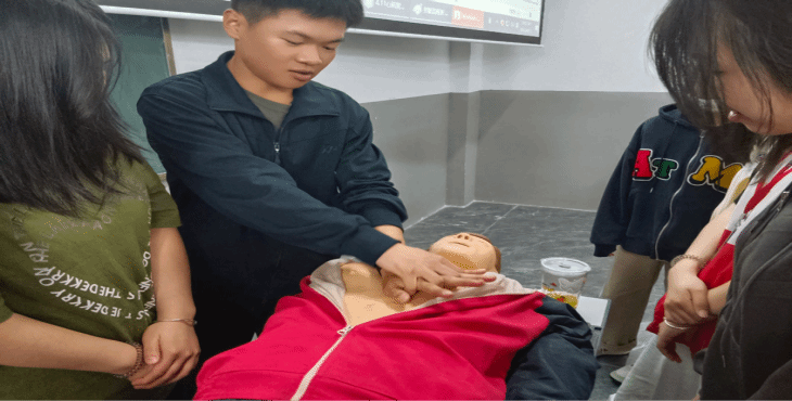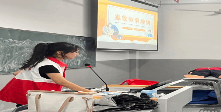 本次讲座由贾星悦同学为学生们做常见急救知识的讲解,主要包括:如何处理烧烫伤、正确使用AED、演示心肺复苏的操作流程,以及胸部按压与人工呼吸的动作要领等。教学完成后,同学们针对讲座内容进行互动提问并上台练习实践。