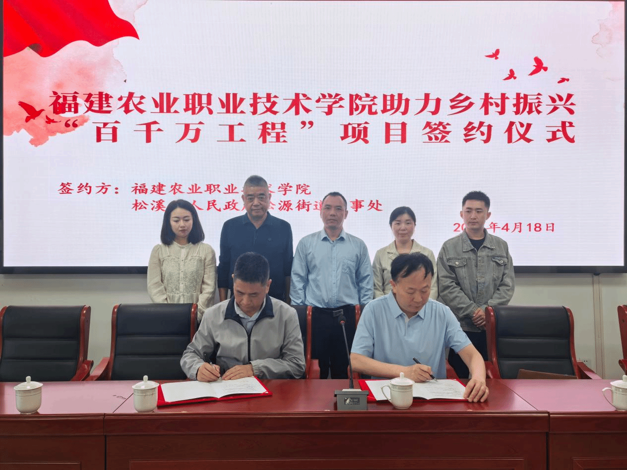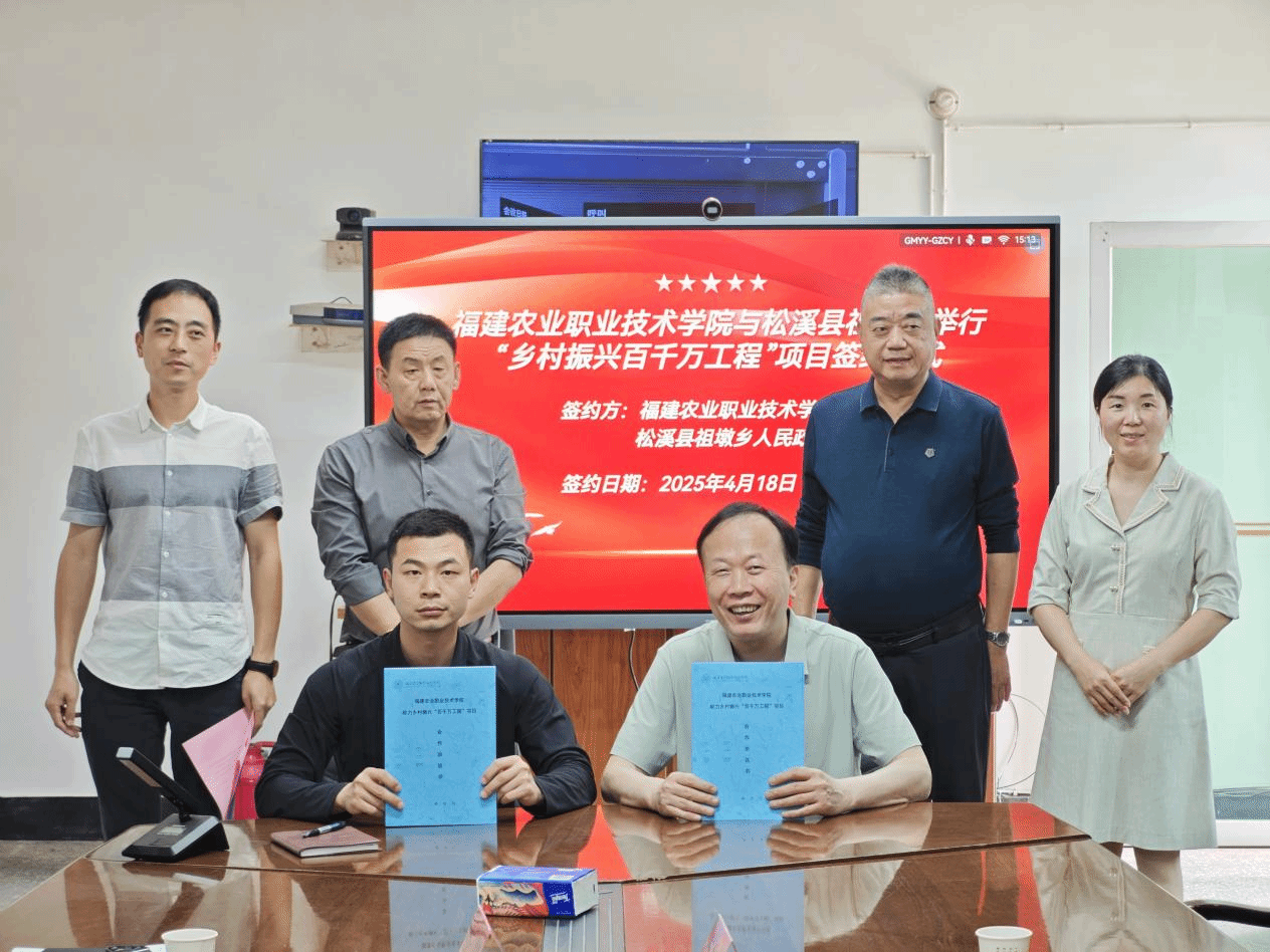 2025年4月18日上午9时,签约仪式在松源街道北门村村部八楼会议室正式启动。松源街道党工委书记徐智福、办事处主任陈行义等街道代表出席活动。徐智福书记强调,松源街道作为松溪县核心区域,亟高校智力支持破解乡村产业瓶颈,此次合作将依托学院农业经济管理市场营销、电子商务专业优势,推动乡村振兴“百千万工程”落地。马风棋表示,学院将整合新媒体营销、电商运营等资源,通过“乡村振兴技术服务团+实训基地”模式,助力松溪打造闽北乡村振兴示范样板。马风棋与陈行义分别代表校地双方签署协议,并合影留念。