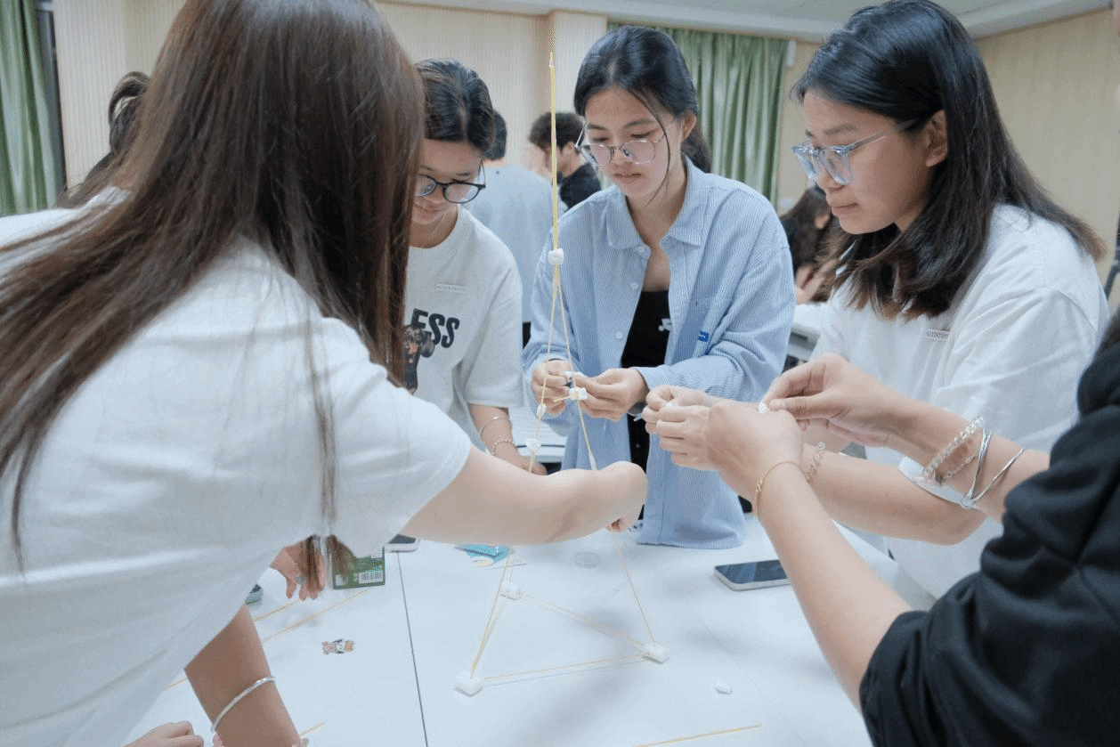同学们展开讨论与分工,利用意大利面、棉花糖等材料搭建高楼,期间还灵活应对“材料短缺、时间压缩”等压力事件。这不仅锻炼了团队协作、沟通分工能力,还让学生们明晰了自身在团队中的角色定位。