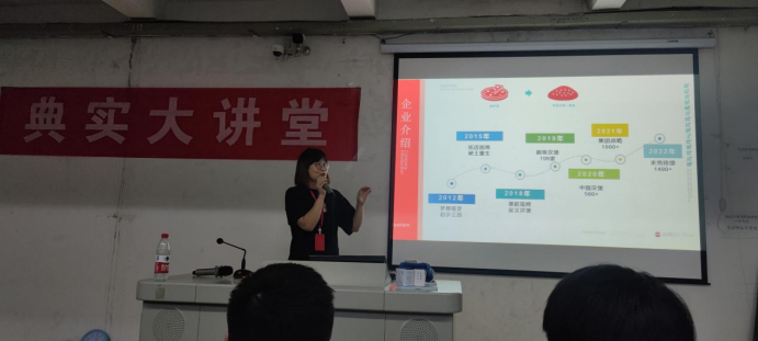 最后,由经管学院会计电算化0907班优秀毕业生、塔斯汀餐饮管理有限公司的郑惠凤经理通过PPT展示、现场互动等方式向同学们介绍了公司概况、企业文化、企业员工培养模式、企业目前的发展状况及发展前景等与同学们作了详尽的解说,并分享了自己步入社会后的成长历程与心路变化为同学们解答了大学生就业应注意的问题,鼓励同学们勇于勇于尝试、热爱生活。