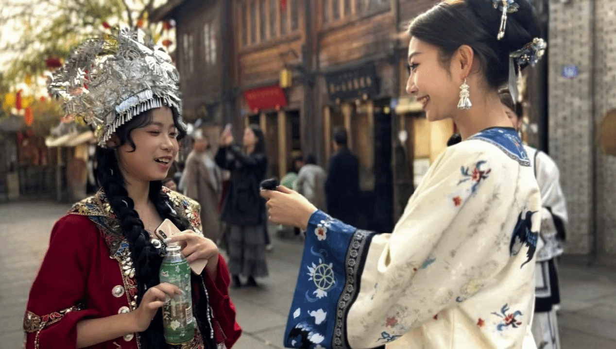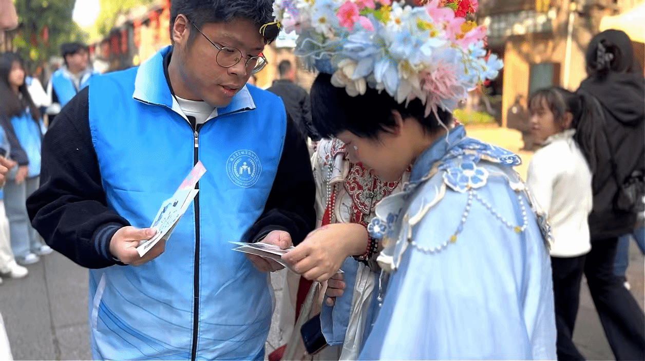 2024年,福州“三条簪”随着自媒体的传播火爆出圈,越来越多的游客慕名来到福州,体验“三条簪”妆造,游览上下杭、三坊七巷、烟台山等历史文化景区,品尝鱼丸、扁肉。青衿榕韵实践队走进福州各个著名景区,与游客们进行了热情的互动交流,并通过采访来往游客,进一步宣传福州历史文化和非物质文化。许多游客表示,很喜欢“三条簪”造型,还可以与其他朝代的各式服装自行搭配,这不仅展示了三条簪独特的锋芒和汉服的秀美,也体现了女性的刚毅之美。实践队成员还精心准备了代表“虎纠”特色的文创明信片作为礼物赠送给游客,用生动的方式宣传特色“福文化”。