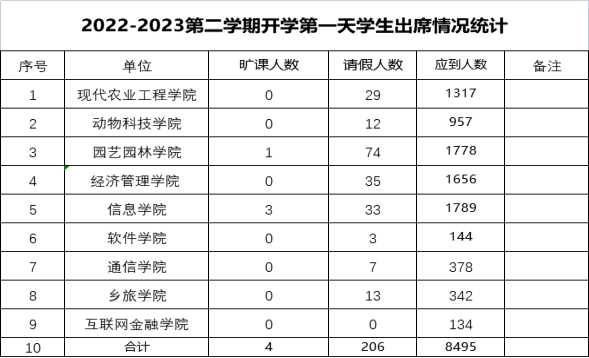学生出勤基本无迟到现象,但请假人数偏多,仅开学第一天,全校请假学生数206人,其后仍有学生请假(见下表)。学生总体精神面貌良好,玩手机现象有所减少,但存在学生不带书进课堂、上课不记笔记的现象。