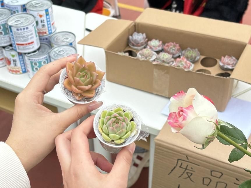 活动当天,同学们热情高涨,纷纷将自己积攒的废纸、塑料瓶、旧书报等可回收物品带到现场,井然有序地排列着,期待能置换到自己喜爱的绿植,还在志愿者的引导下学习了绿植养护方法。