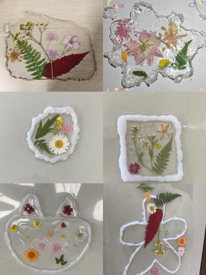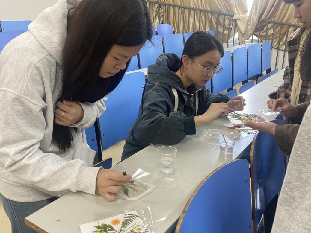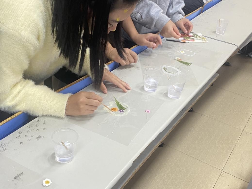 活动现场,工作人员为同学们介绍了干花杯垫的制作流程,为前来参加活动的同学分发材料。同学们发挥创意,用热熔胶棒滴胶后,挑选喜欢的干花摆放在模具中,再倒上滴胶封层,最后将杯垫放到紫外线灯下照射。同学们专注于手工之中,互相分享审美巧思与制作技巧。