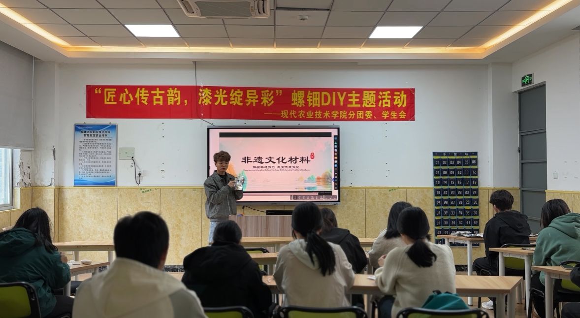 为传承和弘扬中华优秀传统文化,增进同学们对非遗文化的了解,进一步提升审美创造能力,12月12日,现代农业技术学院在教学楼2号楼102举办“匠心传古韵,漆光绽异彩”螺钿 DIY 主题活动。