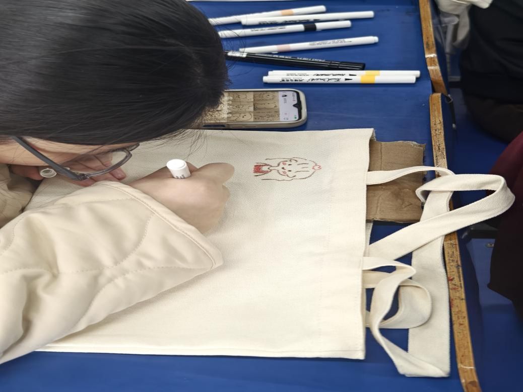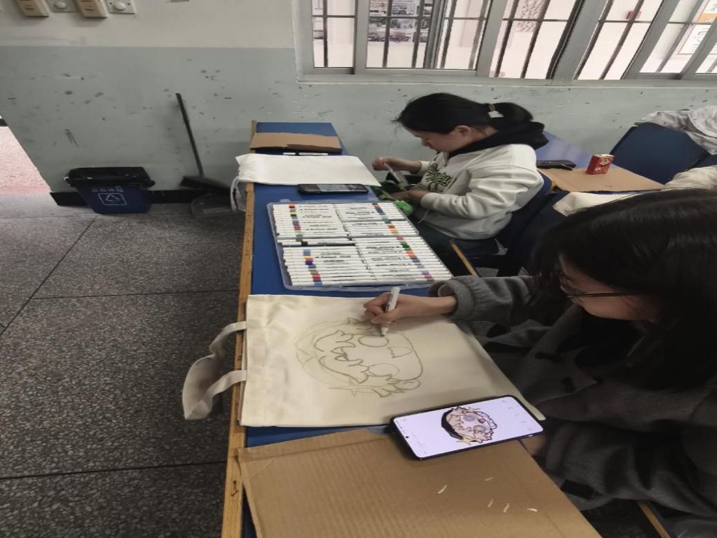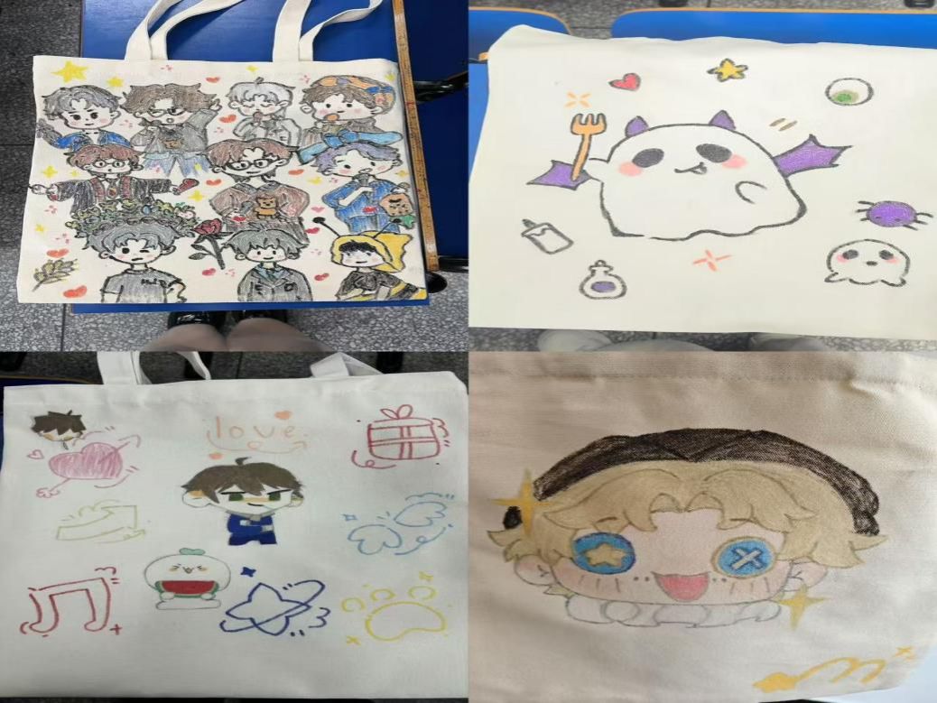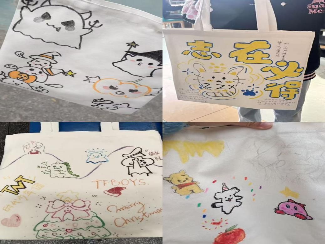 同学们充分发挥自己的想象力,激烈讨论,大胆创作,活动现场一片欢声笑语。各种图案跃然“袋”上,各有各的风格,一个个独具特色的布袋画作出炉。普普通通的布袋,在同学们的手中变成了一件件独一无二的艺术品。