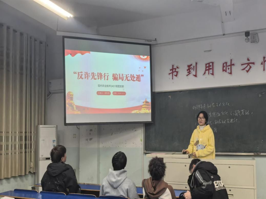 2024年12月,现代农业技术学院组织各团支部开展“反诈先锋行 骗局无处遁”主题团日活动,活动旨在提高师生的安全防范意识,营造安全和谐的校园环境。