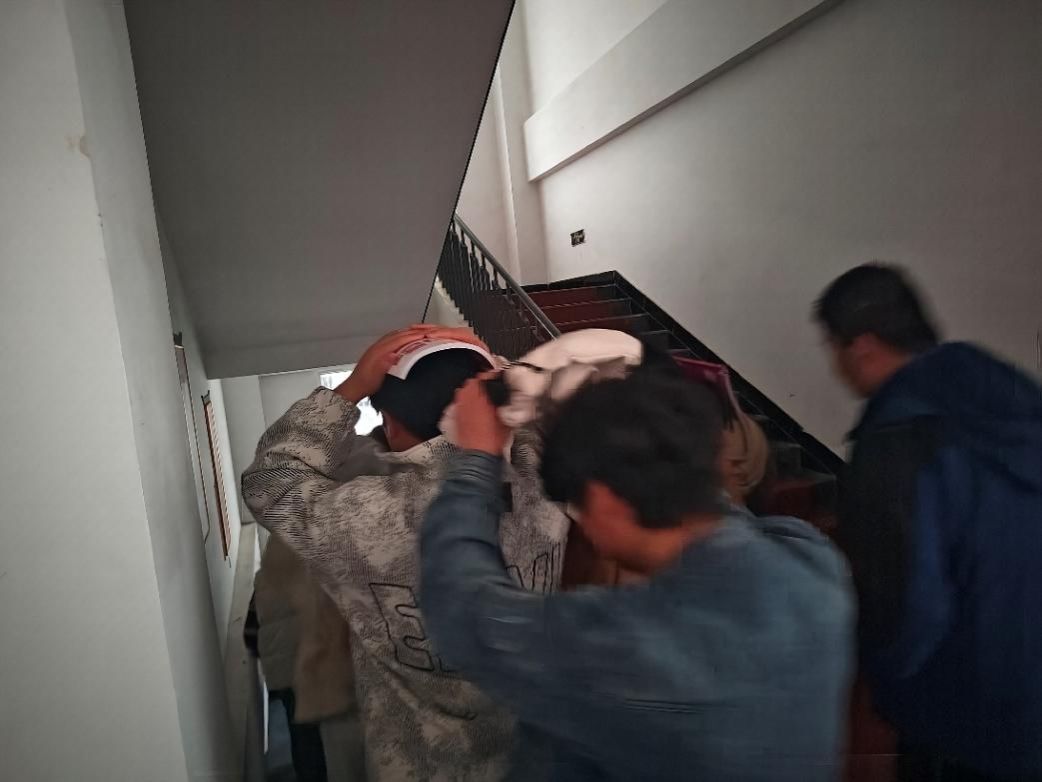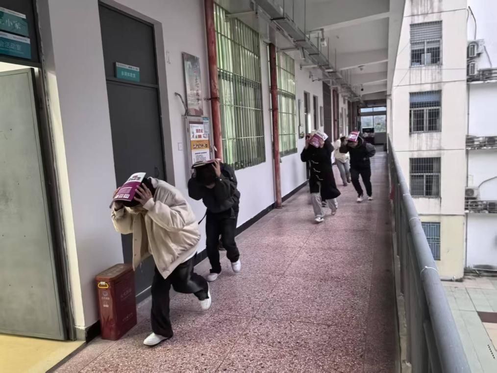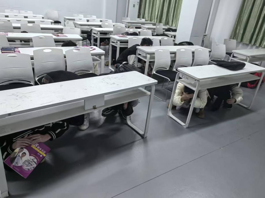 随着第一声警报响起,演练正式开始。教学楼内师生迅速反应,立即蹲伏于课桌下方或承重墙角落,用双手、书本护住头部,进入紧急避险状态。
