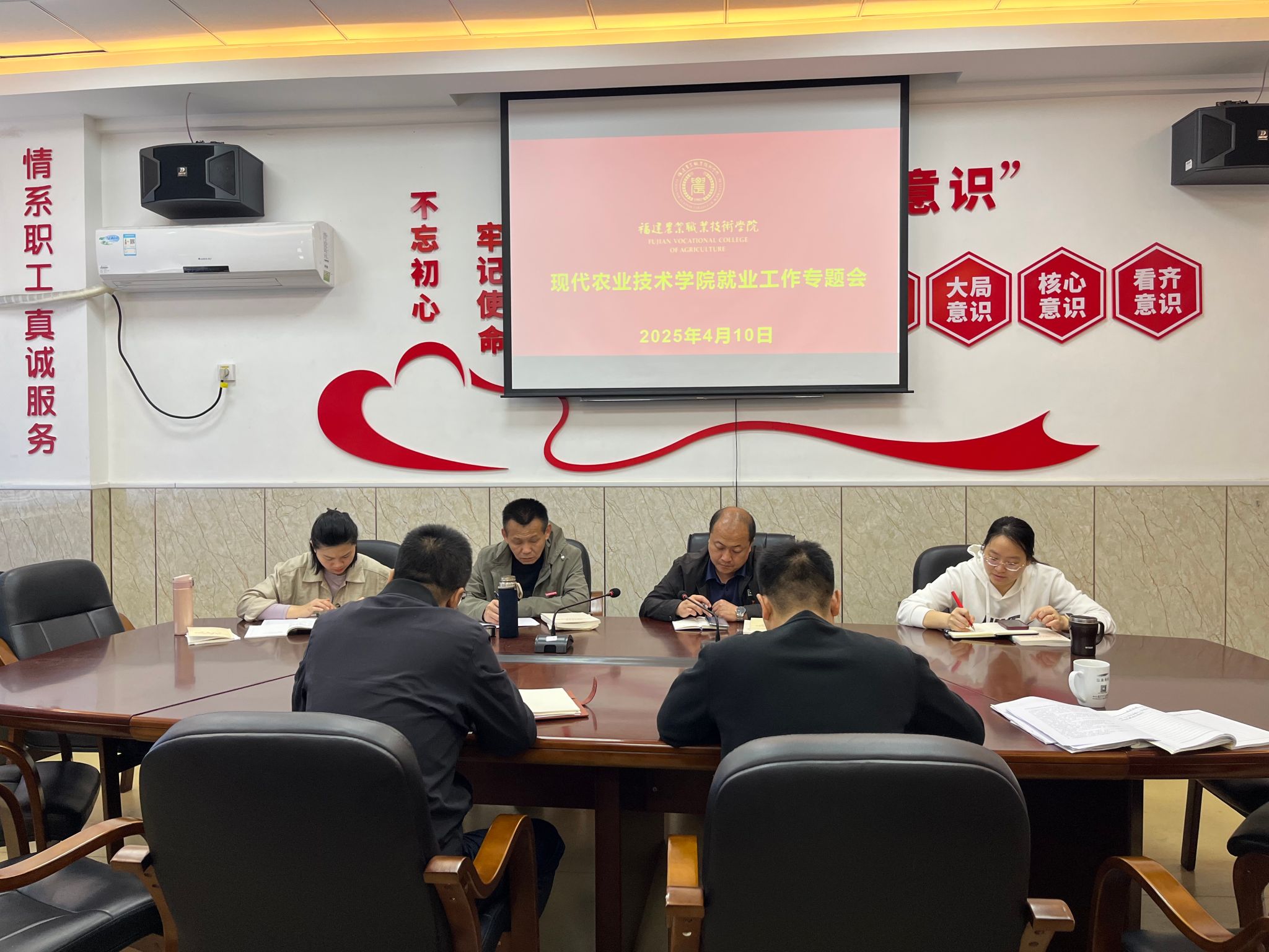 2025年4月10日上午,现代农业技术学院召开就业工作专题会议,学院党总支书记欧高政、院长陈文胜以及部分教职工参加会议。