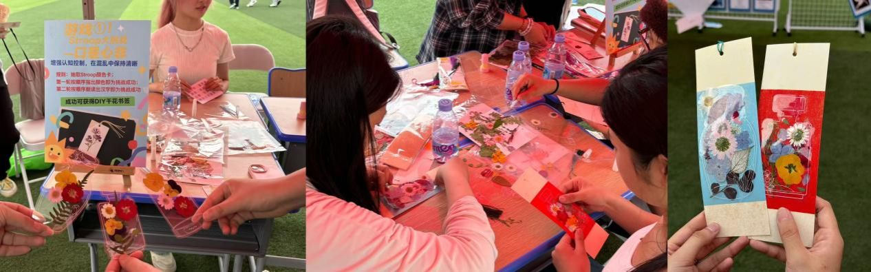 Stroop颜色卡挑战现场气氛热烈,参与者需突破认知惯性,迎接两轮挑战。第一轮,按序指出颜色;第二轮,朗声念出汉字。两轮挑战层层递进,极大地考验着大家的认知控制能力。成功通关者会收获一份精致的DIY干花书签,他们在思维的“碰撞”中深切体会到专注与冷静的力量。
