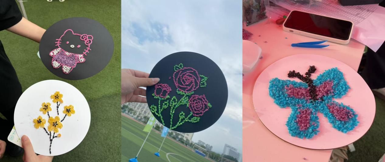 活动现场为参与者提供彩色谷物、胶水、卡纸等材料,同学们根据自己的想法进行图案创作,再将谷物精心拼贴。大家专注地完成着自己的作品,用黑色的米粒勾勒轮廓,用金黄的小米填充细节……一幅幅各具创意、色彩鲜明的图画逐渐展现在大家眼前,也赢得了周围人的阵阵夸赞。