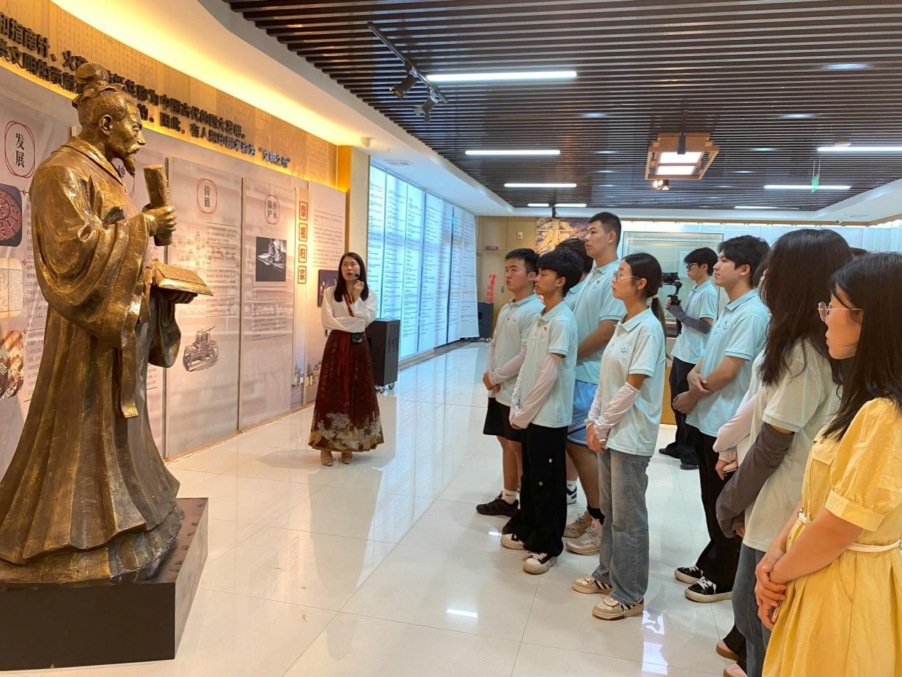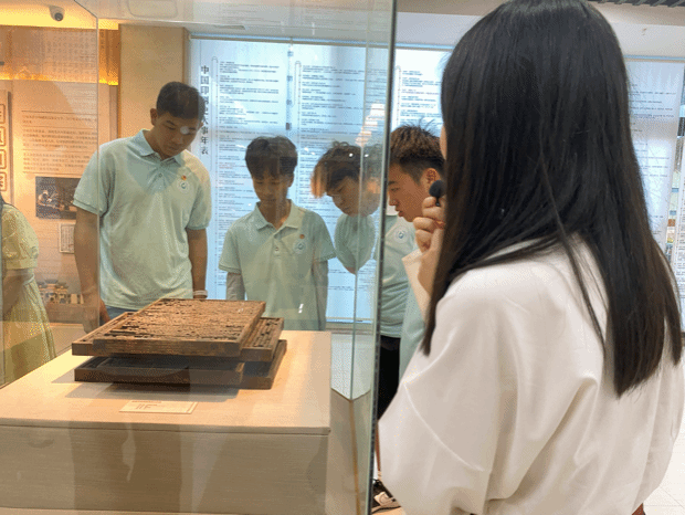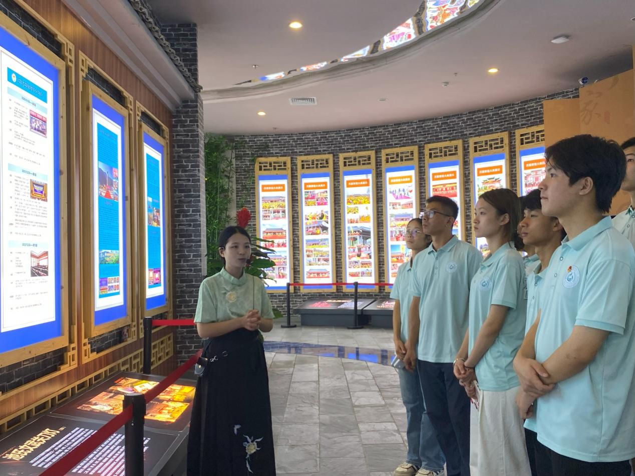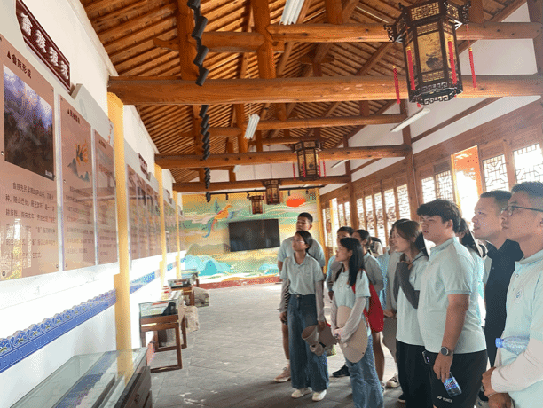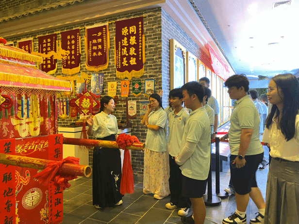 客家文化(闽西)生态保护区于2025年6月获批了国家级文化生态保护区,为深入探寻客家文化的历史根脉与精神底色,实践队来到宁化县世界客属文化交流中心参观“客家三馆”——客家联谊馆、客家图书馆、客家族谱馆。展厅以巨龙图腾为脊梁,蜿蜒的“时光长河”自脚下流淌,象征客家源流于此、客家文化源远流长。在讲解员的带领下,队员们穿梭于客家服饰、农耕器具、婚俗器具之间,那些褪色的蓑衣、精美的绣裙、充满烟火气的竹编器具,无声讲述着客家人“南迁万里,不忘其根”的坚韧故事。