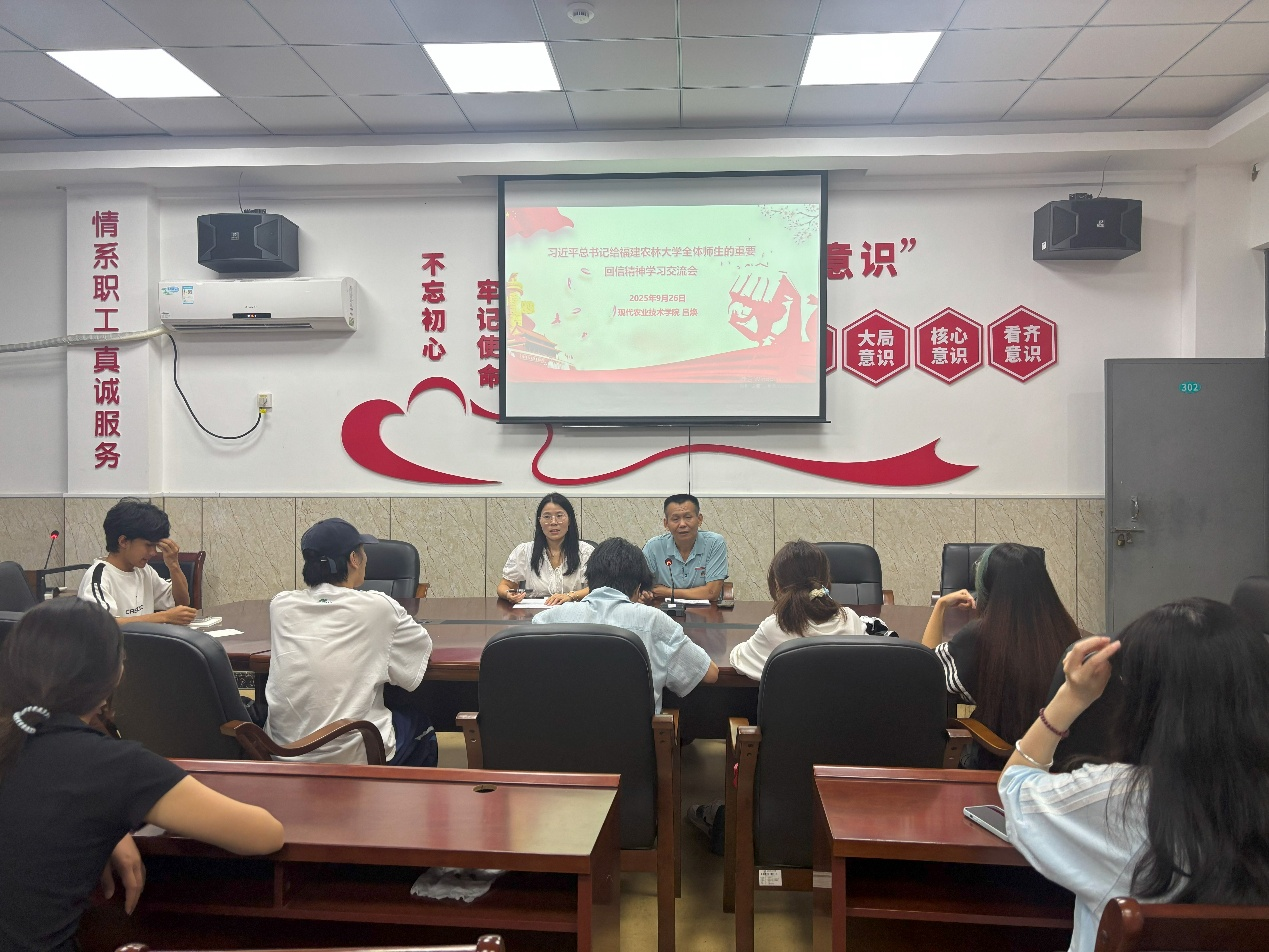 为深入学习领会习近平总书记给福建农林大学全体师生重要回信的深刻内涵与殷切期望,激发广大学子的专业自豪感与时代使命感,9月26日晚,我院团委举办了一场特别的主题学习交流会——“厚植家国情怀 践行强农使命”,深入学习习近平总书记给福建农林大学全体师生的重要回信精神。我院院长陈文胜老师、团委书记吕焕老师、团学部门全体学生干部及新生团干齐聚一堂,共话理想、共谋成长。