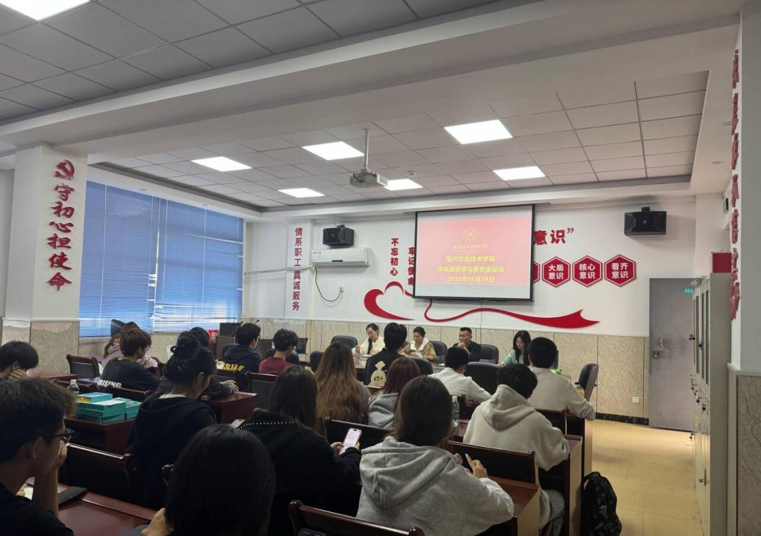 为精准破解课堂手机管理难题,深化优良学风建设,构建师生协同育人长效机制,营造专注高效的教学氛围。10月29日下午,现代农业技术学院召开“共商手机管理 共筑高效课堂”——学风建设专题座谈会。现代农业技术学院院长陈文胜、教学督导员代表及各专业班级学习委员39人围绕课堂秩序优化与学风提升展开交流,座谈会由现代农业技术学院副院长陈丰主持。