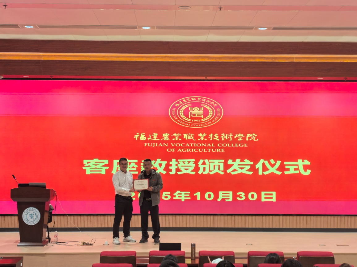 培训会前,现代农业技术学院院长陈文胜为肖常辉颁发客座教授证书。