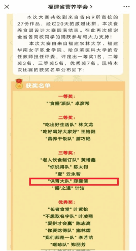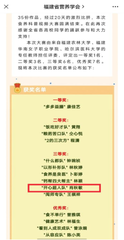 5月15日-6月5日,现代农业工程学院师生参加第九届“全民营养周”活动之“合理膳食,食养是良医”福建省高校大学生食养食谱与科普微视频大赛,我院派出四支团队参加食谱与科普视频大赛,与省内本科院校共同竞技。其中食品检验检测专业肖秋敏、陈冰、陈莉莉、袁忠琴设计制作的《食品营养科普小课堂》视频(指导老师陈丰、程晓琳)和食品质量与安全专业郑雯倩,郑雨欣,叶育君,赖萍设计的《50-65岁年轻老人食谱》(指导老师陈丰、林春发)分别获得三等奖。