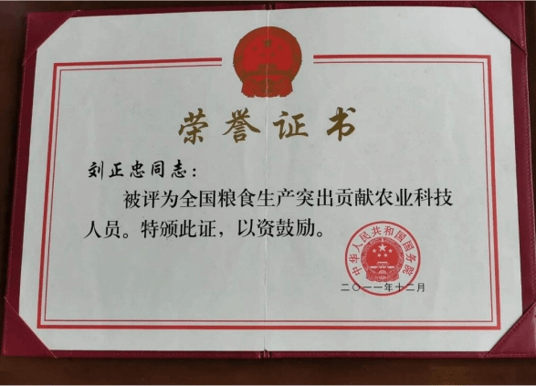 2011年12月被中华人民共和国国务院评为全国粮食生产突出贡献农业科技人员,享受全国劳模待遇。