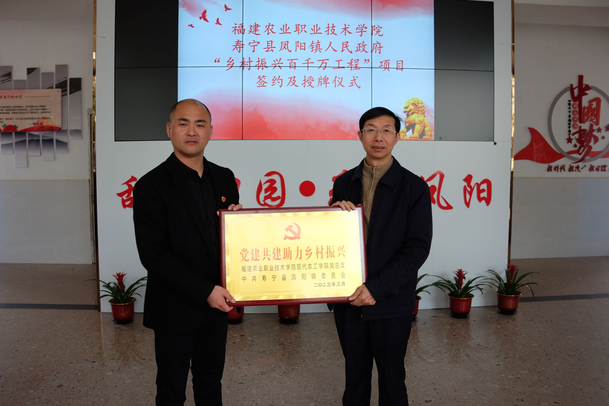 现代农业工程学院党总支书记余勋信与凤阳镇党委副书记、镇长王松惠签约并授牌