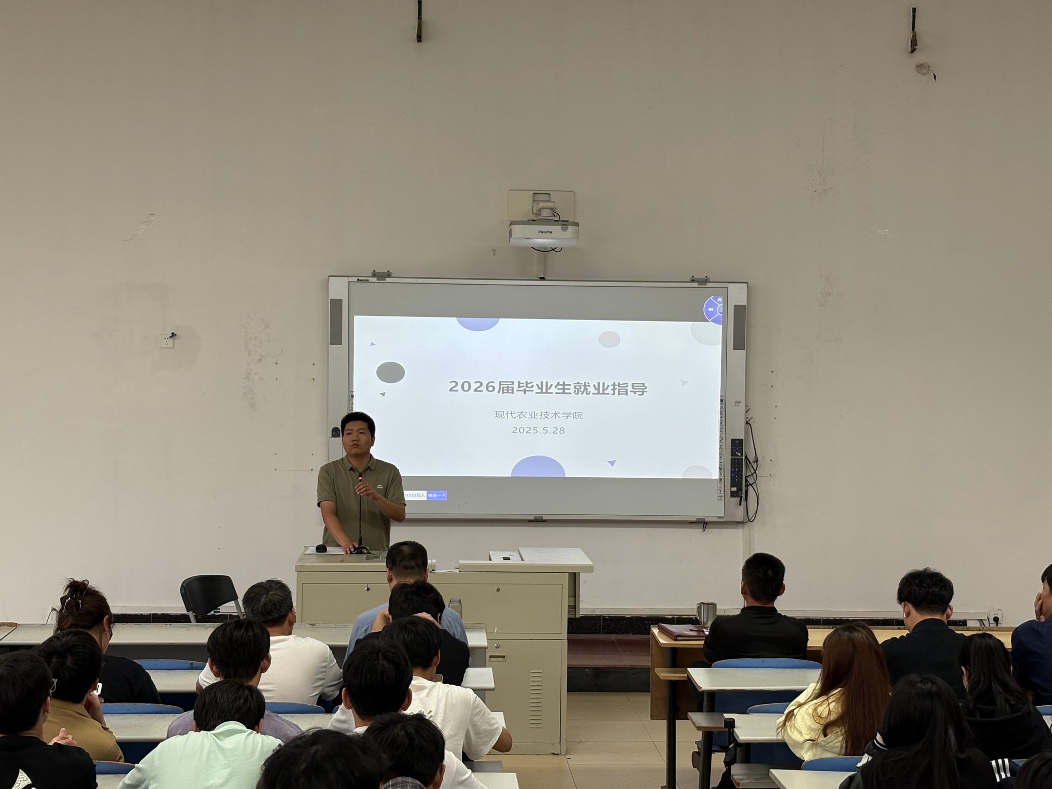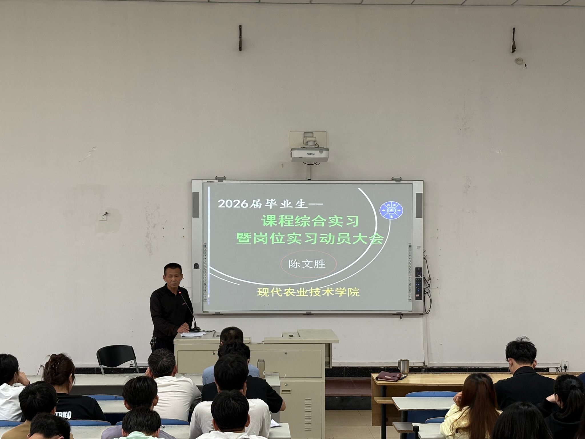 2025年5月28日下午,现代农业技术学院举办2026届毕业生实习动员大会。学院欧高政书记、陈文胜院长、冯冬林副院长、陈丰副院长,毕业班辅导员及580多位2026届毕业生参加了会议。