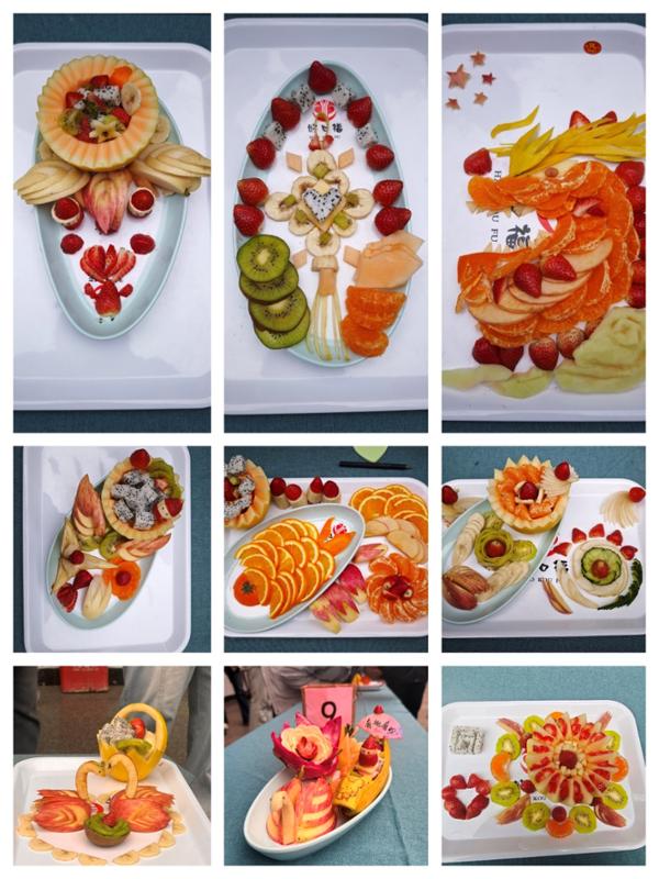 活动现场,苹果的红、香蕉的黄、火龙果的粉、橙子的橙……五彩缤纷的水果铺满长桌,仿佛一场视觉与味觉的双重邀约。参赛同学们自由组队,围绕“籽籽同心”主题,巧妙构思、精心协作,发挥想象力与动手能力,通过切割、拼接、雕琢,转化为一幅幅栩栩如生、寓意深远的艺术作品。“我们想用火龙果的‘籽’呼应‘籽籽同心’,再用香蕉拼成手拉手的小人,象征团结与温暖。”参赛同学笑着介绍。每一份作品,都是创意与心意的交织,是劳动与美育的融合,更是对“铸牢中华民族共同体意识”最生动的青春诠释。