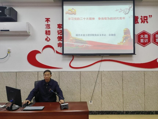 余勋信书记首先认真细致的向大家讲解党的二十大的主题、学习的五个方面、三个务必、中国式现代化的五个特征,他指出,学习宣传党的二十大精神是当前和今后一个时期全党全国的首要政治任务,大家要利用好这次机会认真学习领会二十大精神,努力提升自我争做有为青年。