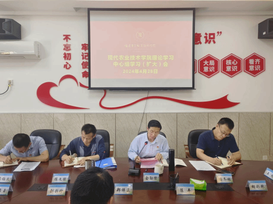 2024年4月28日下午,现代农业技术学院召开学院党总支理论学习中心组学习(扩大)会议,学院党总支书记余勋信主持会议,学院领导班子成员,教师、党员代表参加会议。