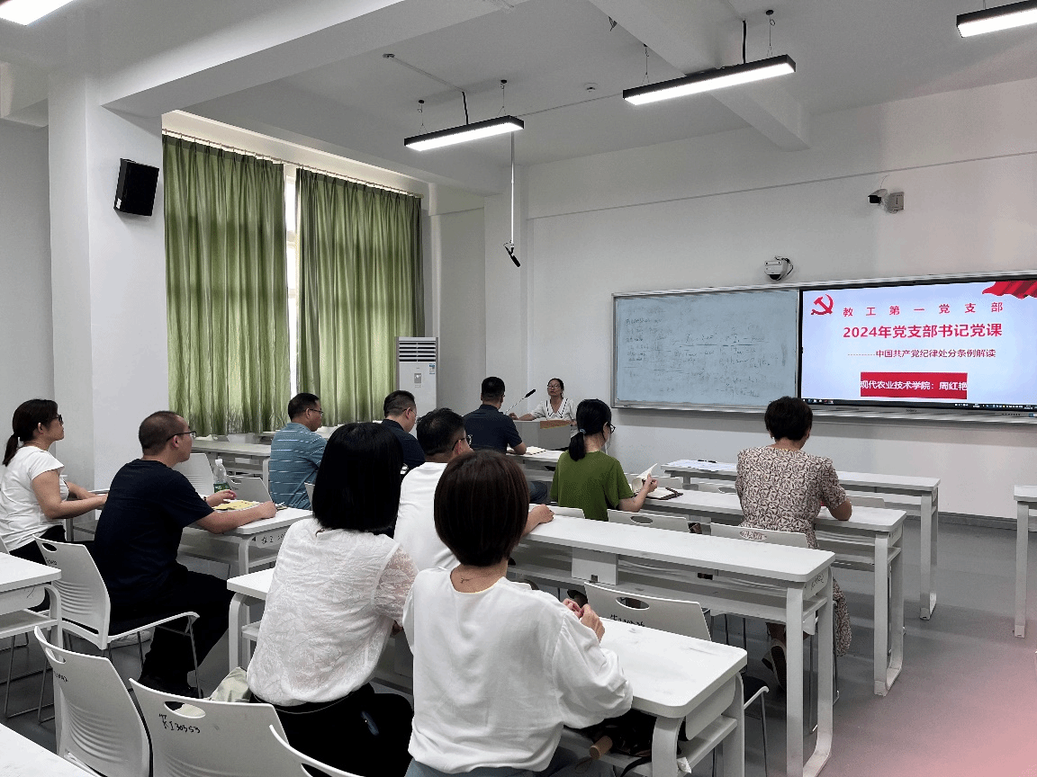 按照党纪学习教育工作安排,现代农业技术学院教工第一党支部于6月25日在教学楼2号楼303教室开展党纪学习教育专题活动,解读《中国共产党纪律处分条例》。本次党课由教工第一党支部书记周红艳主讲,教工第一党支部全体党员参加。