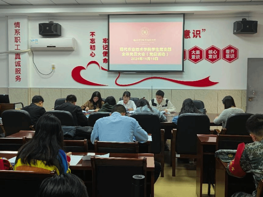 2024年11月18日,现代农业技术学院学生党支部在教学2号楼302会议室召开全体党员大会,讨论吸收许勤睿等4位发展对象为中共预备党员。会议由学生党支部书记翁佩莹主持。