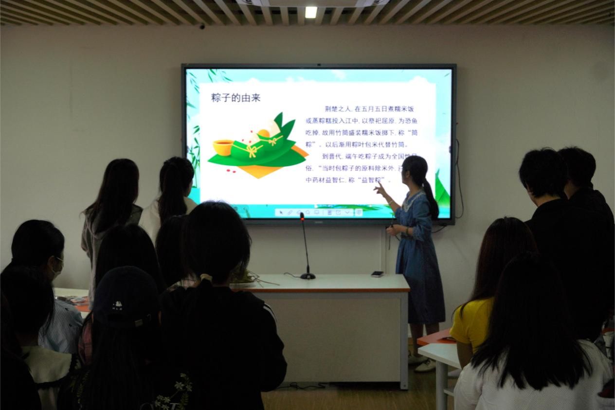 活动伊始,学生党支部书记翁佩莹向在场师生介绍了赛龙舟、挂艾草、佩香囊等传统习俗背后的文化寓意,并深情讲述了爱国诗人屈原的故事,号召师生在体验传统技艺的同时,感悟家国情怀,坚定文化自信。