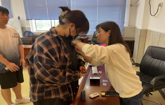 (团总支书记胡彩艳老师为新团员佩戴团徽)