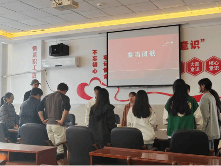 会议伊始,团歌奏响,团员们目光坚定,带着激动的心情奏唱团歌,会议由此拉开序幕。