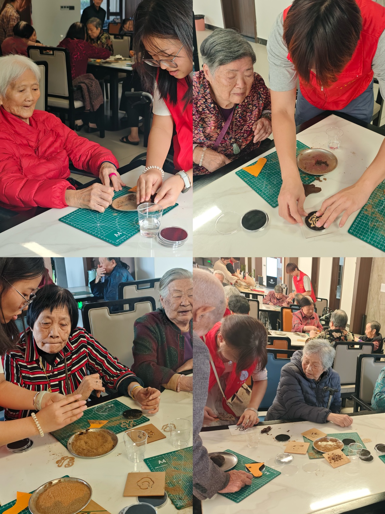 简单的休息与交流后,活动进入第二个环节——制香DIY体验。志愿者向老人们介绍了中国传统香文化的渊源,以及檀香粉等天然香料的安神静心之效。在志愿者的协助下,老人们饶有兴致地将香粉、粘粉混合、揉捏、入模、定型,亲手制作出一个个寓意吉祥的印香。制作过程中,欢声笑语不断,淡淡的香韵弥漫在空气中,不仅陶冶了情操,更让老人们感受到了亲手创作的乐趣与成就感。