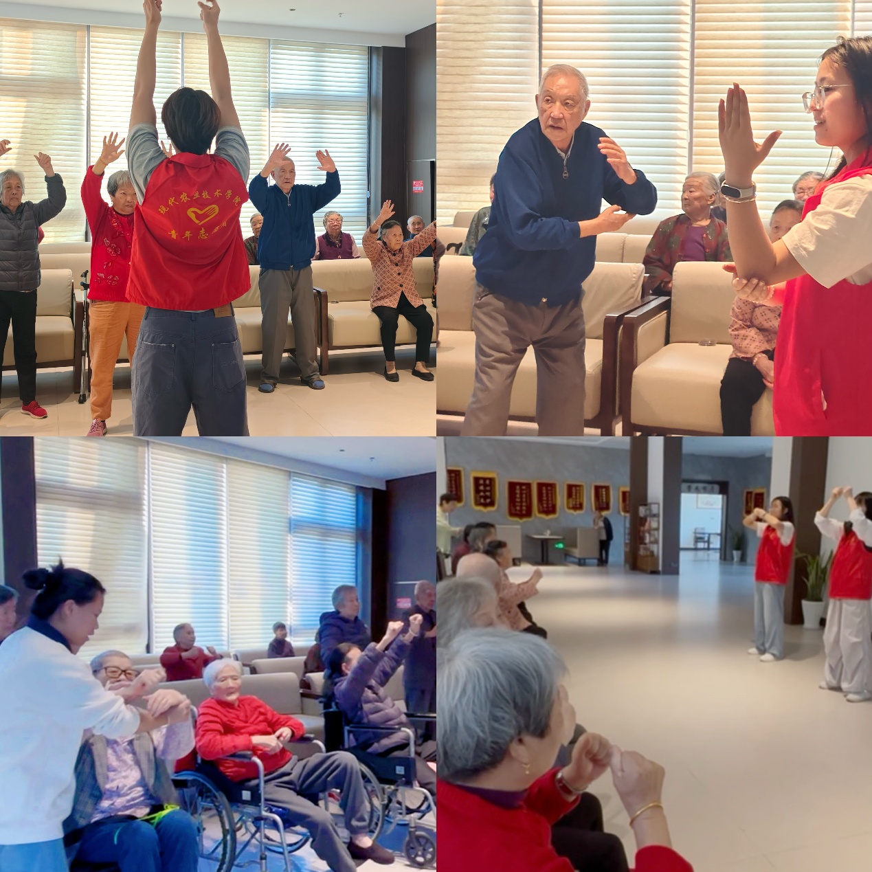 本次活动在静馨嘉园的温馨氛围中拉开帷幕,志愿者们首先为在场的爷爷奶奶们送上了亲切的问候。随后进入第一个环节——传统健身操“五禽戏”教学。志愿者代表首先讲解了五禽戏的起源与养生功效,随后重点演示并分解教学了“虎式”动作。在舒缓的伴奏中,志愿者们走到老人身边,开展一对一辅助指导,鼓励大家量力而行、活动筋骨。老人们兴致勃勃,跟着志愿者的节奏模仿动作,现场气氛轻松而活跃。
