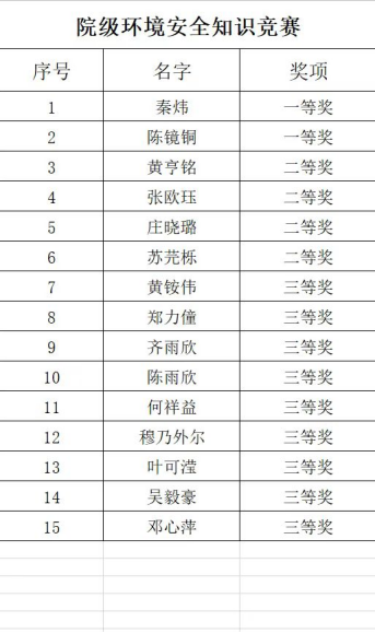 本次环境安全知识竞赛为线下比赛,按班级进行竞赛,共设10道判断题和10道单选题。内容包含垃圾分类、绿色低碳出行、污水循环处理、节能节电等问题。同学们认真对待,积极作答,后根据竞赛成绩,进行奖项设置。本次竞赛共15名同学脱颖而出,现将竞赛排名结果展示如下: