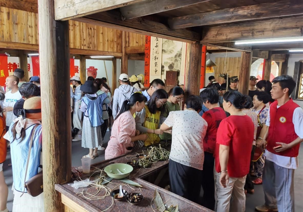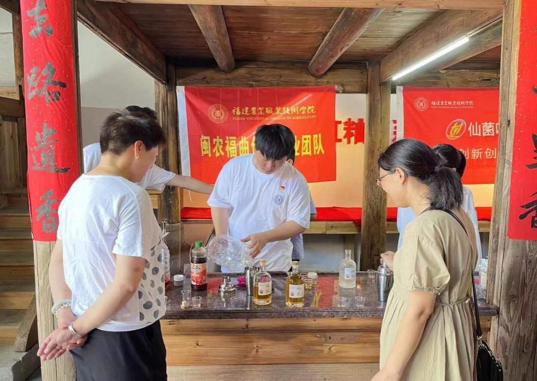 7月6日上午,学院社会实践队结合自身专业特色,现场向北墘村民传授了茶饮、酒饮调配,酒糟粽子的制作技艺,并向北墘村的“师父们”学习了本地粽子系绳法。现场调配制作的系列产品受到了当地村民及游客的一致好评。