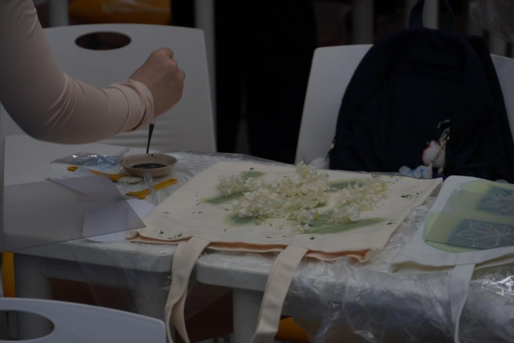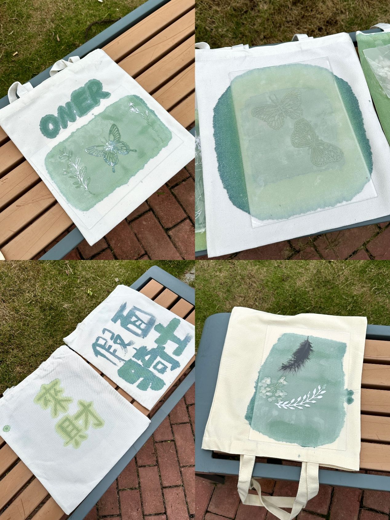 在手工制作环节,同学们自由分组,发挥创意,拼贴干花、树叶、工具模型等素材,精心设计帆布包图案。涂刷蓝晒液的帆布包在阳光下接受“光的馈赠”,曝光时间随光线强度调整,期间志愿者全程巡回指导,解答调配比例、图案构图等问题。当帆布包浸入清水,白色影像逐渐清晰,惊叹声此起彼伏——有人定格农具轮廓致敬劳动者,有人用花草勾勒田园图景,每一件作品都成为独一无二的“劳动剪影”。