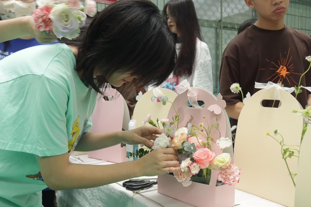 活动现场,花香四溢。花艺老师用通俗易懂的语言,从插花原理、颜色搭配、花枝修剪以及如何摆放等知识向同学们做了细致的讲解。随后,在花艺老师指导下,同学们开始动手插花、修剪枝叶,创作属于自己的插花作品。